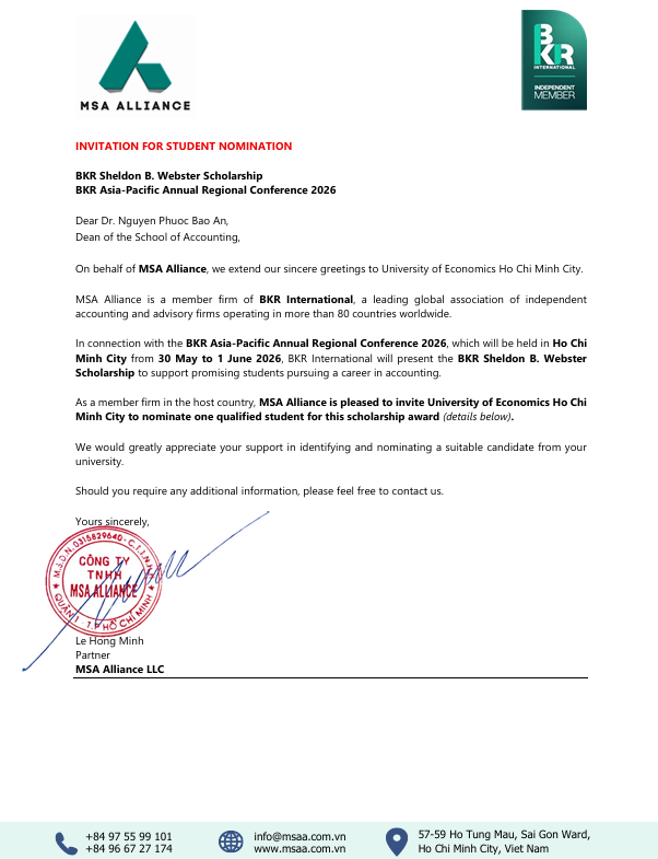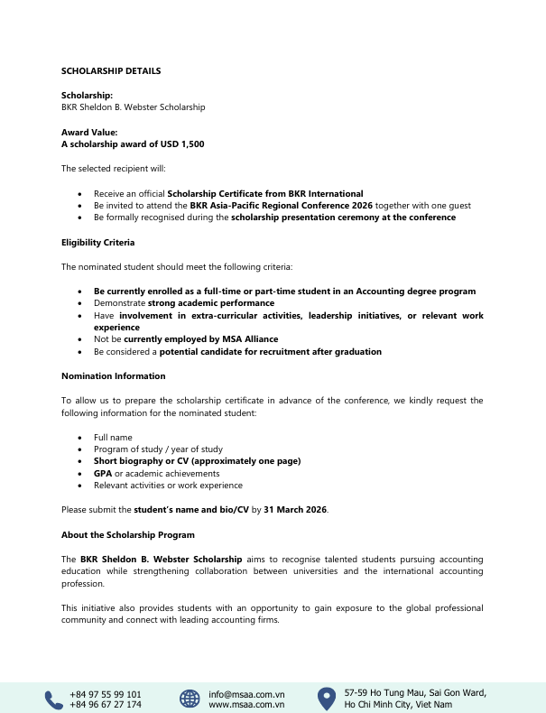 Khoa Kế toán trân trọng thông báo đến sinh viên về chương trình BKR International Sheldon B. Webster Scholarship 2026, do MSA Alliance phối hợp triển khai.