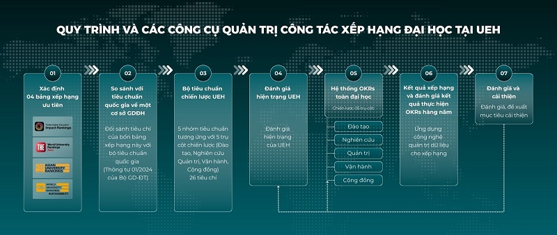 Để quản trị xếp hạng một cách bền vững, UEH triển khai quy trình quản trị với 7 bước: