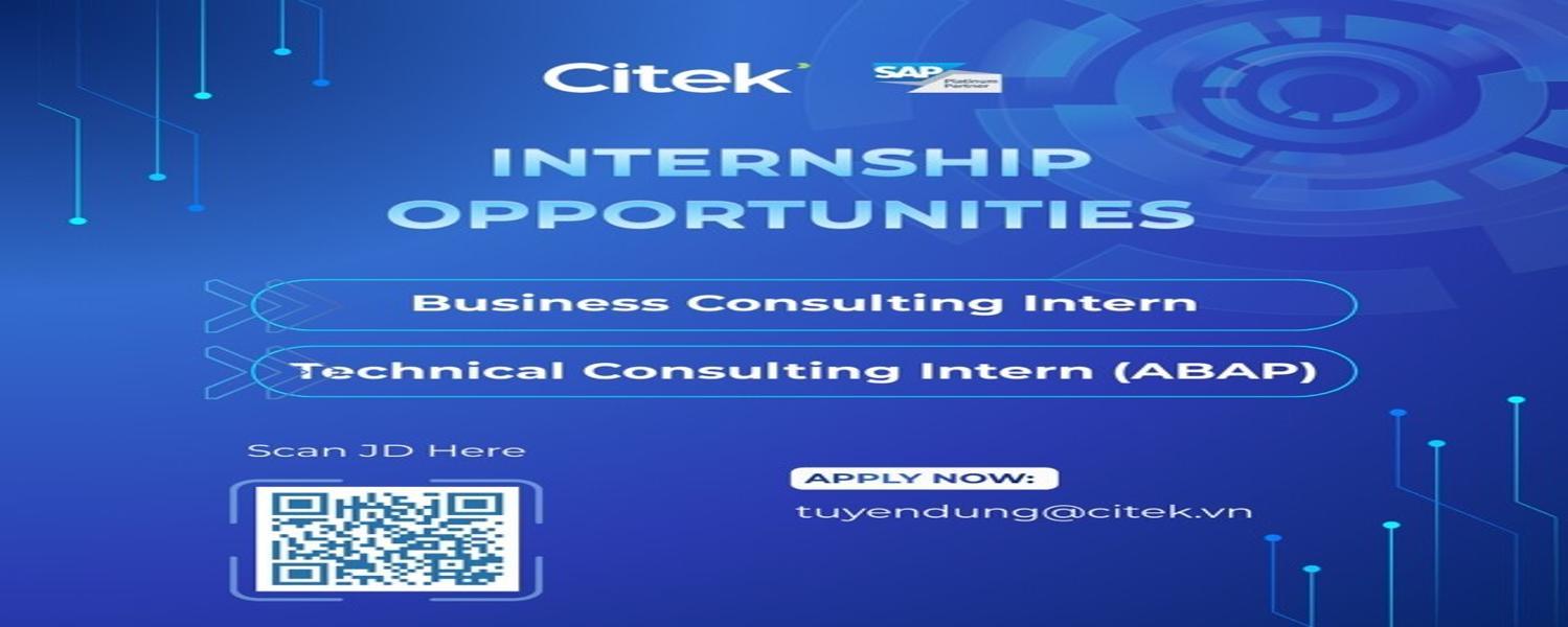 Trong giai đoạn đầu năm 2026, Citek chính thức mở đơn tuyển dụng thực tập sinh cho hai định hướng mũi nhọn: 1. CÁC VỊ TRÍ TUYỂN DỤNG BUSINESS CONSULTING INTERN: Thực tập sinh Tư vấn nghiệp vụ SAP. TECHNICAL CONSULTING INTERN (ABAP): Thực tập sinh Tư vấn kỹ thuật (Lập trình ABAP).
