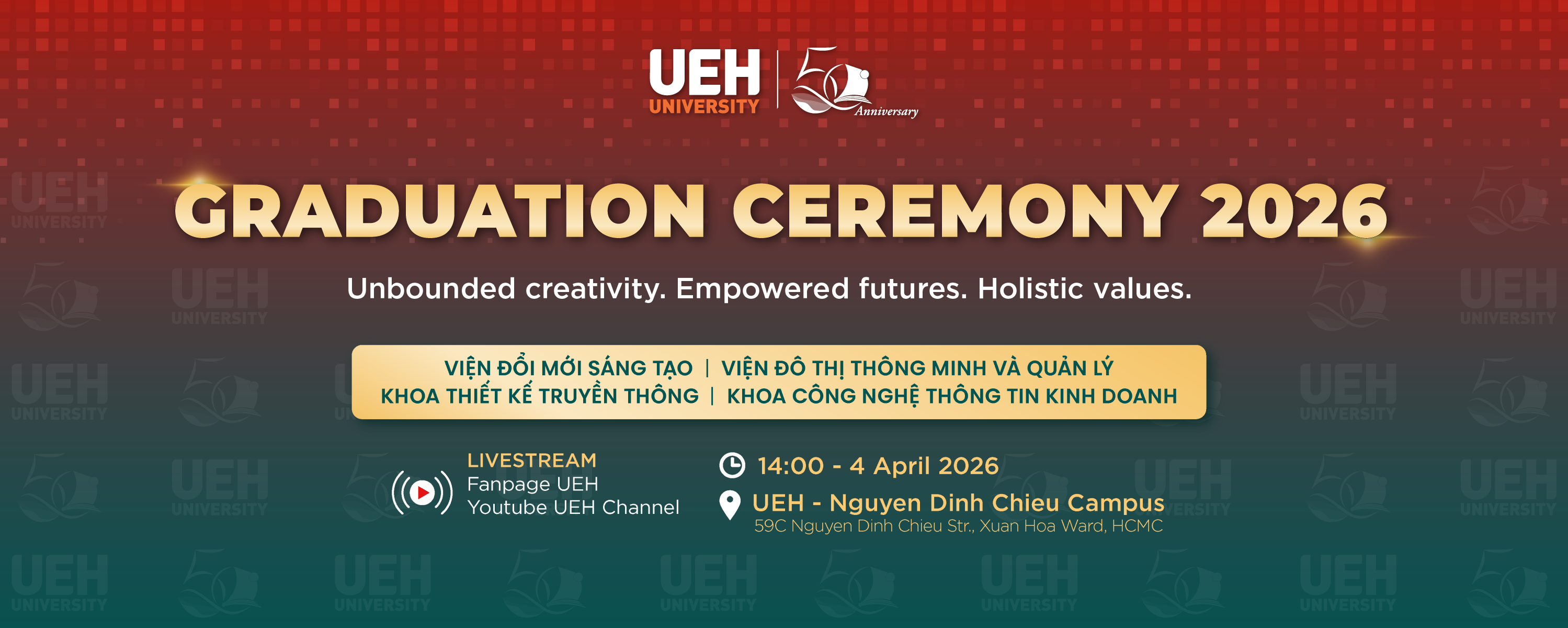 Chương trình sẽ được livestream trên hệ thống kênh truyền thông chính thức của UEH, giúp gia đình, thầy cô và bạn bè cùng theo dõi và chia sẻ niềm tự hào trong khoảnh khắc ý nghĩa này: