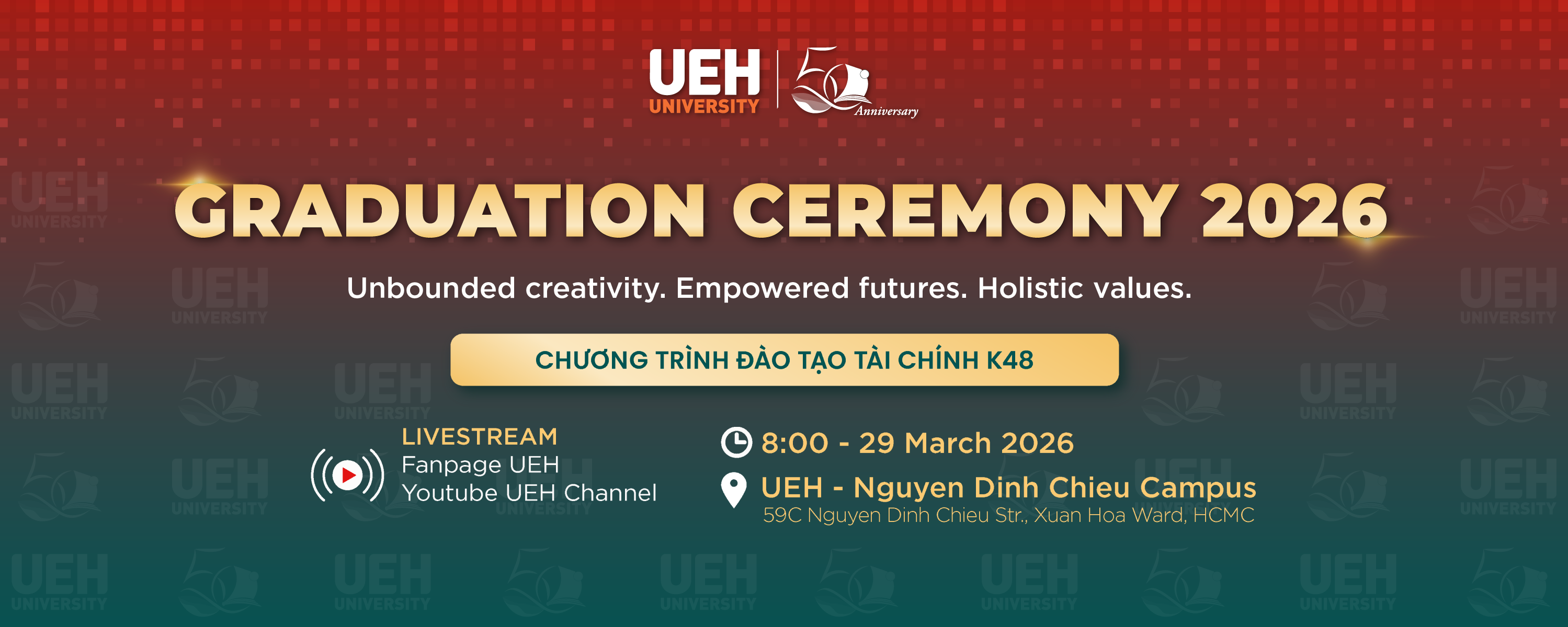 Chương trình sẽ được livestream trên hệ thống kênh truyền thông chính thức của UEH, giúp gia đình, thầy cô và bạn bè cùng theo dõi và chia sẻ niềm tự hào trong khoảnh khắc ý nghĩa này: