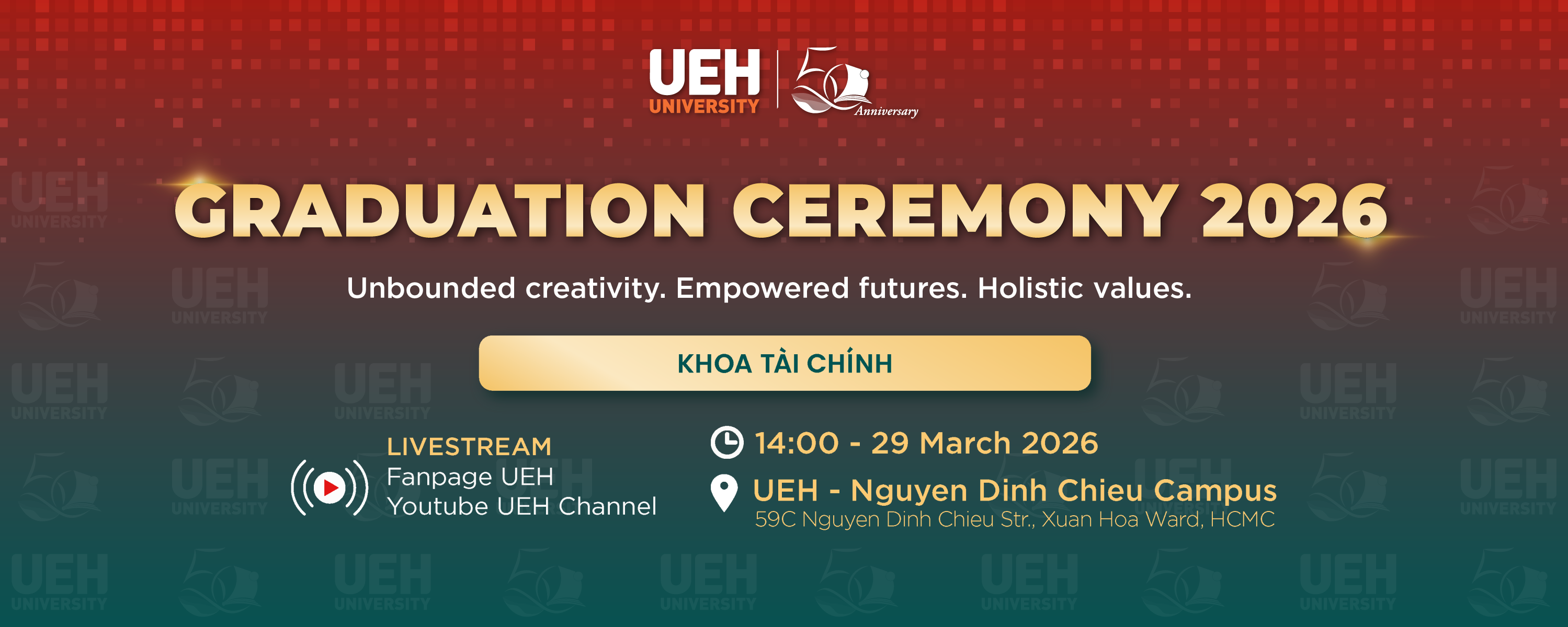 Chương trình sẽ được livestream trên hệ thống kênh truyền thông chính thức của UEH, giúp gia đình, thầy cô và bạn bè cùng theo dõi và chia sẻ niềm tự hào trong khoảnh khắc ý nghĩa này:
