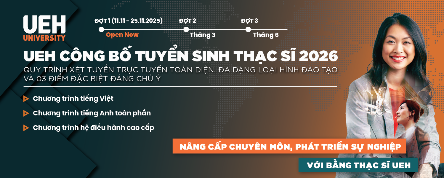Đại học Kinh tế Thành phố Hồ Chí Minh (UEH) công bố tuyển sinh trình độ Thạc sĩ năm 2026 với 03 đợt tuyển trong năm, áp dụng đồng thời hai hình thức: xét tuyển thẳng và thi tuyển. UEH tiếp tục tối ưu hóa quy trình nộp hồ sơ trực tuyến với đa dạng các loại hình đào tạo bằng tiếng Việt, tiếng Anh toàn phần, và các chương trình hệ điều hành cao cấp, đáp ứng nhu cầu học tập và phát triển của học viên.