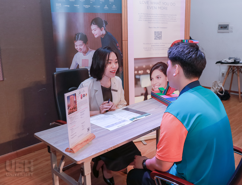 Ngày hội việc làm Marriott bắt đầu một cách sôi động bằng các câu hỏi về tập đoàn Marriott cũng như các thương hiệu Marriott đang quản lý trên toàn thế giới cũng như tại Việt Nam. Phần thứ 2 cũng là nội dung chính quan trọng của chương trình, đó là sự chia sẻ của các tổng quản lý khách sạn về hành trình nghề nghiệp, quá trình thăng tiến, các thách thức cũng như thuận lợi khi làm việc trong ngành khách sạn. Mỗi tổng quản lý mang đến một câu chuyện khác nhau, giúp các bạn có thể thấy nhiều con đường khác nhau để trở thành một tổng quản lý trong tương lai. Dưới sự dẫn dắt của hai cựu sinh viên UEH là chị Xuân Mai và anh Thanh Đức, phiên tọa đàm diễn ra một cách gần gũi và sôi động.
