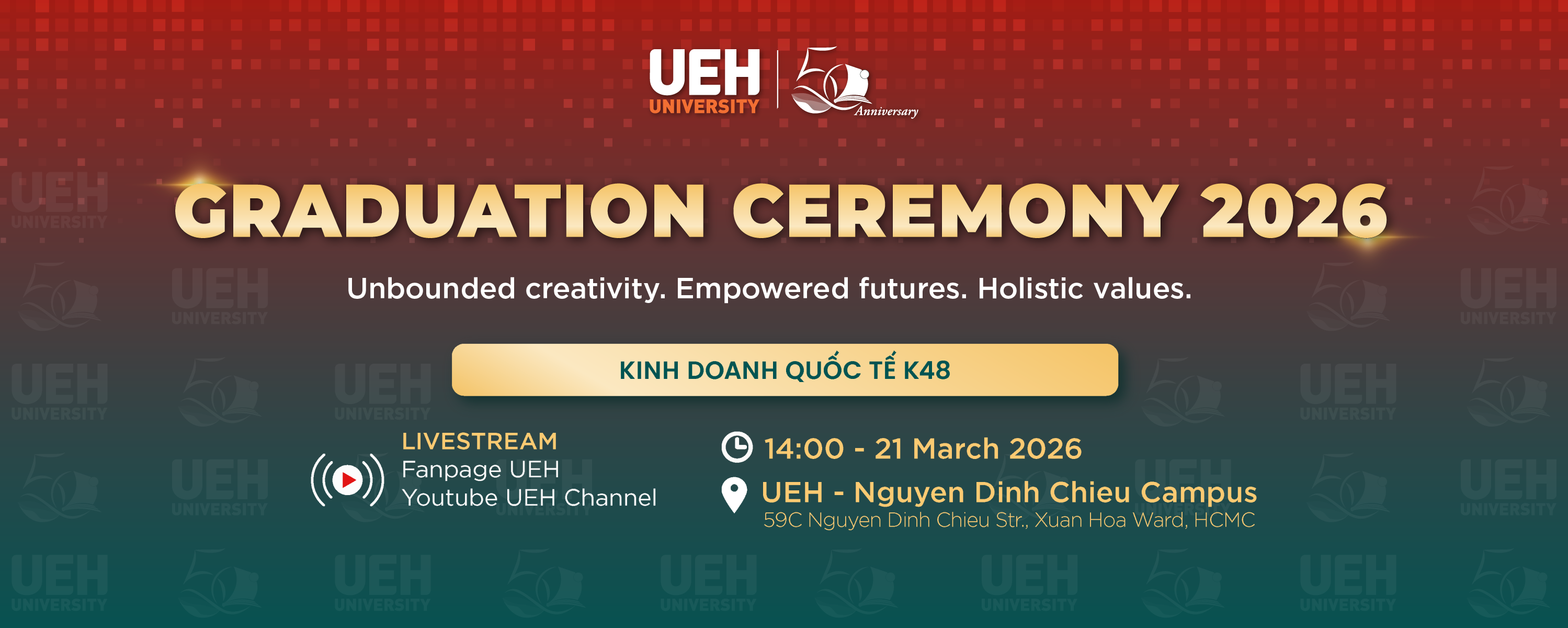 Để lưu lại những khoảnh khắc đầy ý nghĩa này, hành trình trưởng thành của các Tân cử nhân CTĐT Kinh doanh quốc tế (Khóa 48) sẽ được LIVESTREAM trên hệ thống kênh truyền thông chính thức của UEH:
