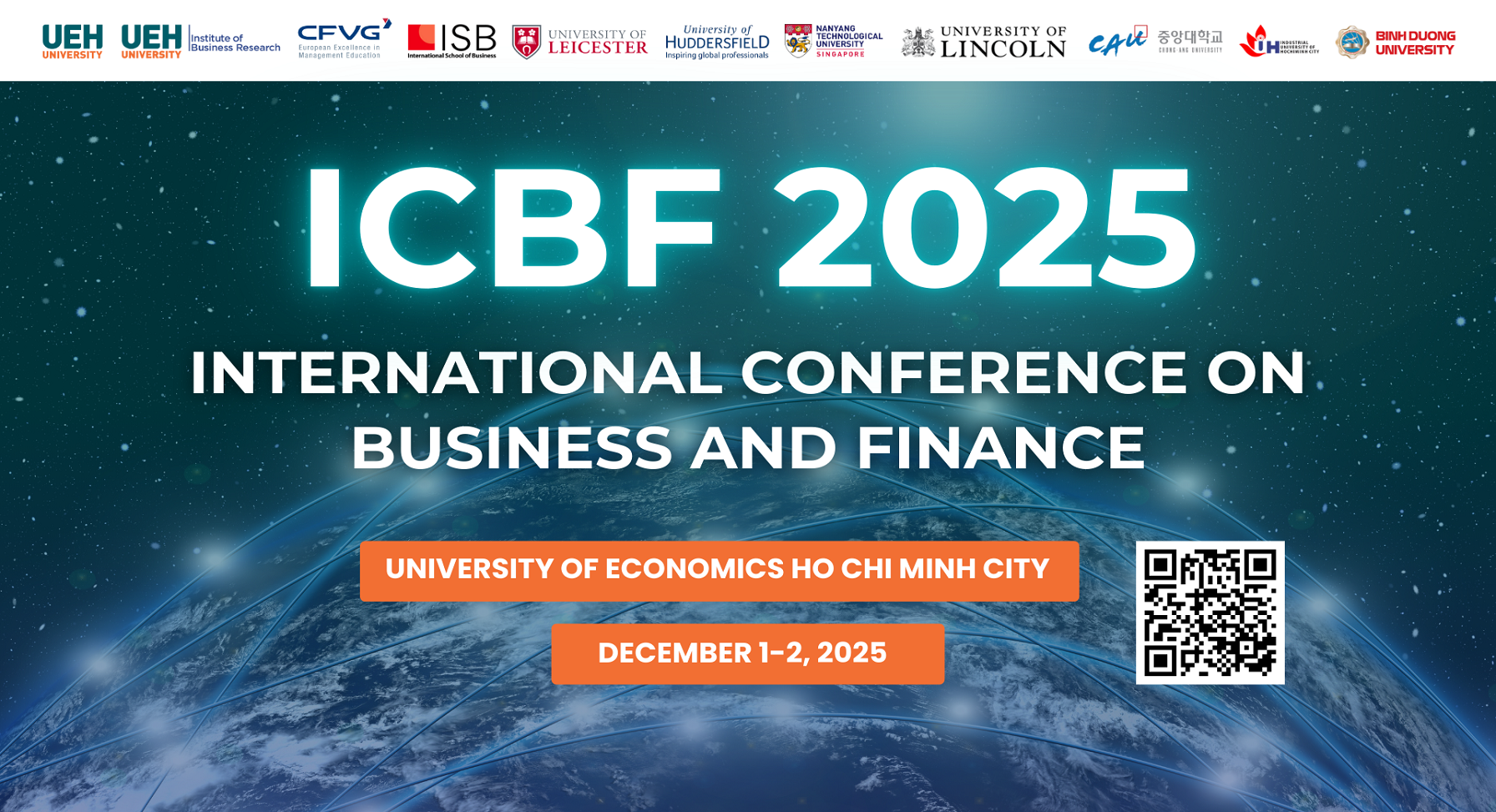 Tiếp nối thành công của Hội thảo Khoa học Quốc tế thường niên với chủ đề: “International Conference on Business and Finance 2024", Hội thảo ICBF 2025 sẽ được Đại học Kinh tế Thành phố Hồ Chí Minh (UEH, CFVG, ISB, IBR) cùng các đơn vị đồng tổ chức: Đại Học Lincoln - Vương quốc Anh và Đại học Công nghệ Nanyang (NTU) – Singapore. Các đơn vị tài trợ: Đại Học Chung - Ang, Trường Đại Học Công Nghiệp TP. Hồ Chí Minh, Trường Đại Học Bình Dương, Trường Đại Học Thủ Dầu Một.