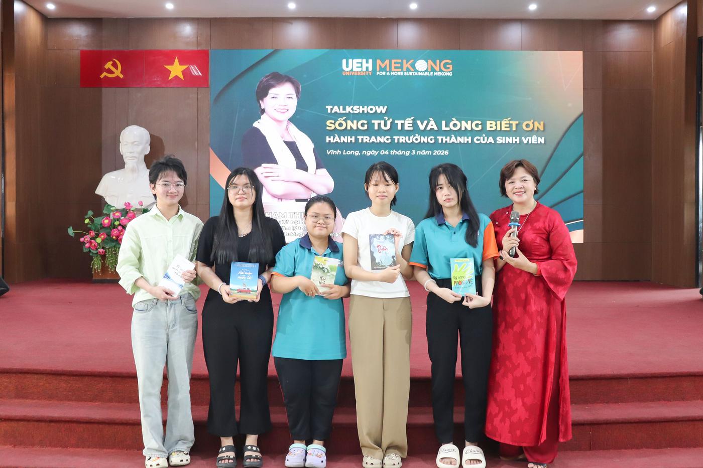 Ngày 04/3/2026, tại Hội trường A, UEH Mekong tổ chức Chương trình tư vấn tâm lý dành cho sinh viên, với chủ đề “Sống tử tế và lòng biết ơn - Hành trang trưởng thành của sinh viên” và chủ đề “Phụ nữ trí thức trong gia đình và sự nghiệp”.