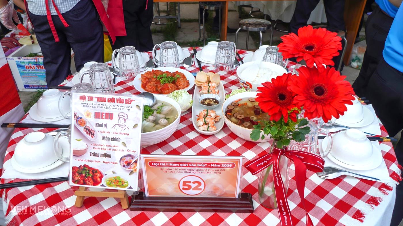Hòa trong không khí thi đua sôi nổi chào mừng 116 năm Ngày Quốc tế Phụ nữ (08/3/1910 - 08/3/2026) và 1986 năm Khởi nghĩa Hai Bà Trưng, ngày 4/3/2026 tại Khu Du lịch Trường An Tỉnh Vĩnh Long, Đội thi của Công đoàn cơ sở UEH Mekong đã tích cực tham gia Hội thi “Nam giới vào bếp” năm 2026 do Liên đoàn Lao động tỉnh Vĩnh Long tổ chức. Hội thi không chỉ là hoạt động thiết thực hướng đến ngày 8/3 mà còn tạo nên không khí vui tươi, gắn kết trong tập thể đoàn viên, người lao động.