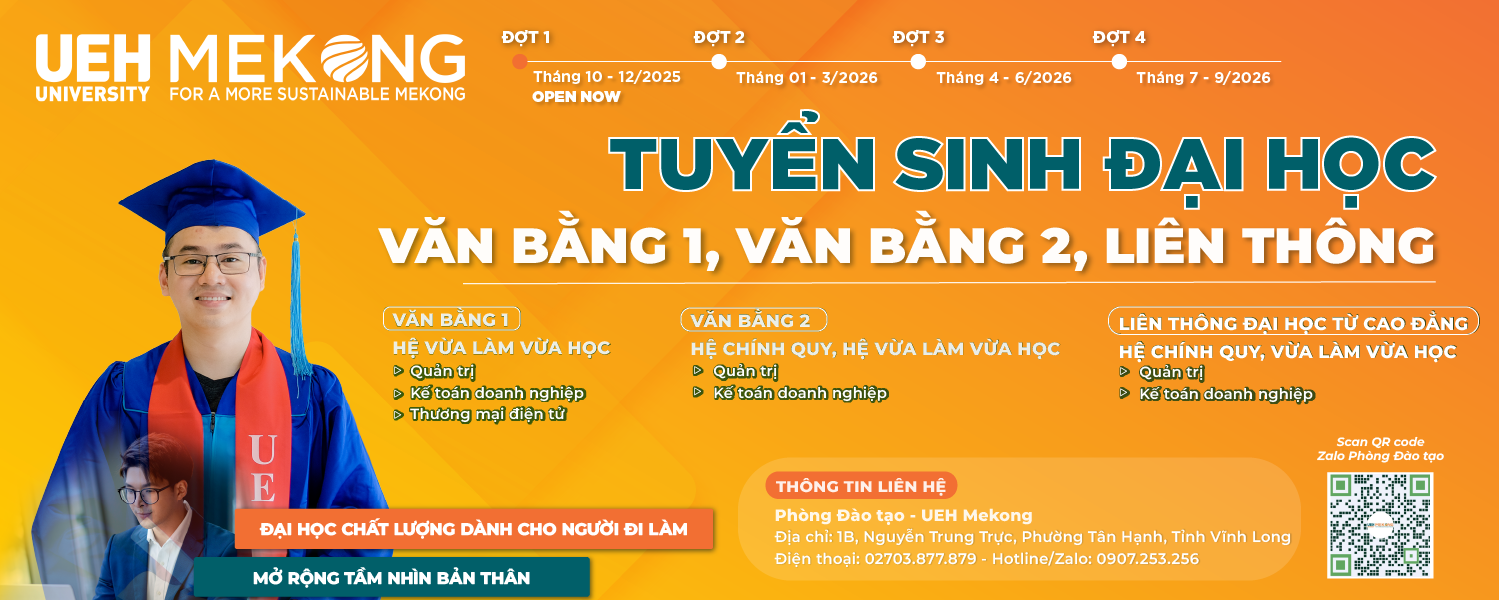 Đại học Kinh tế Thành phố Hồ Chí Minh (UEH) thông báo tuyển sinh trình độ đại học các hình đào tạo đợt 01 năm 2026, học tại Vĩnh Long (UEH Mekong), cụ thể như sau:
