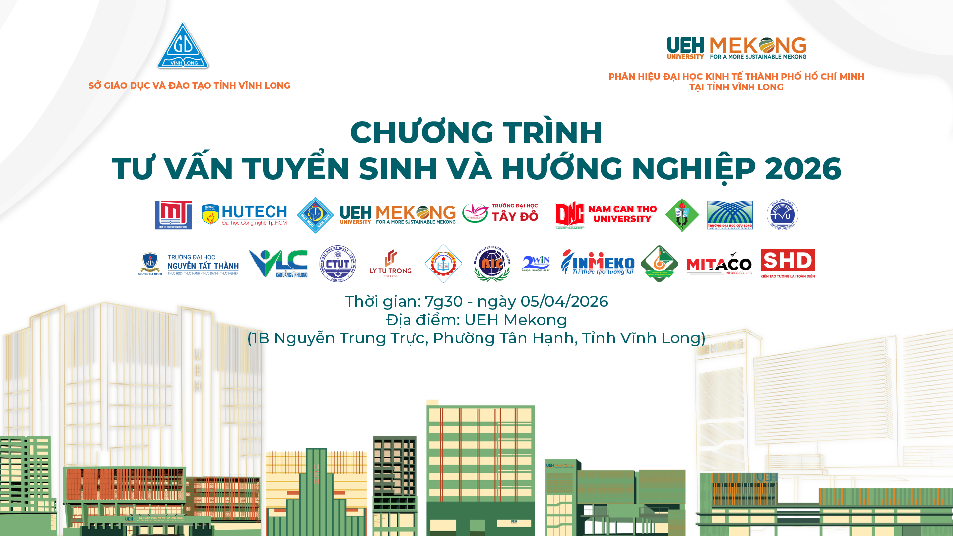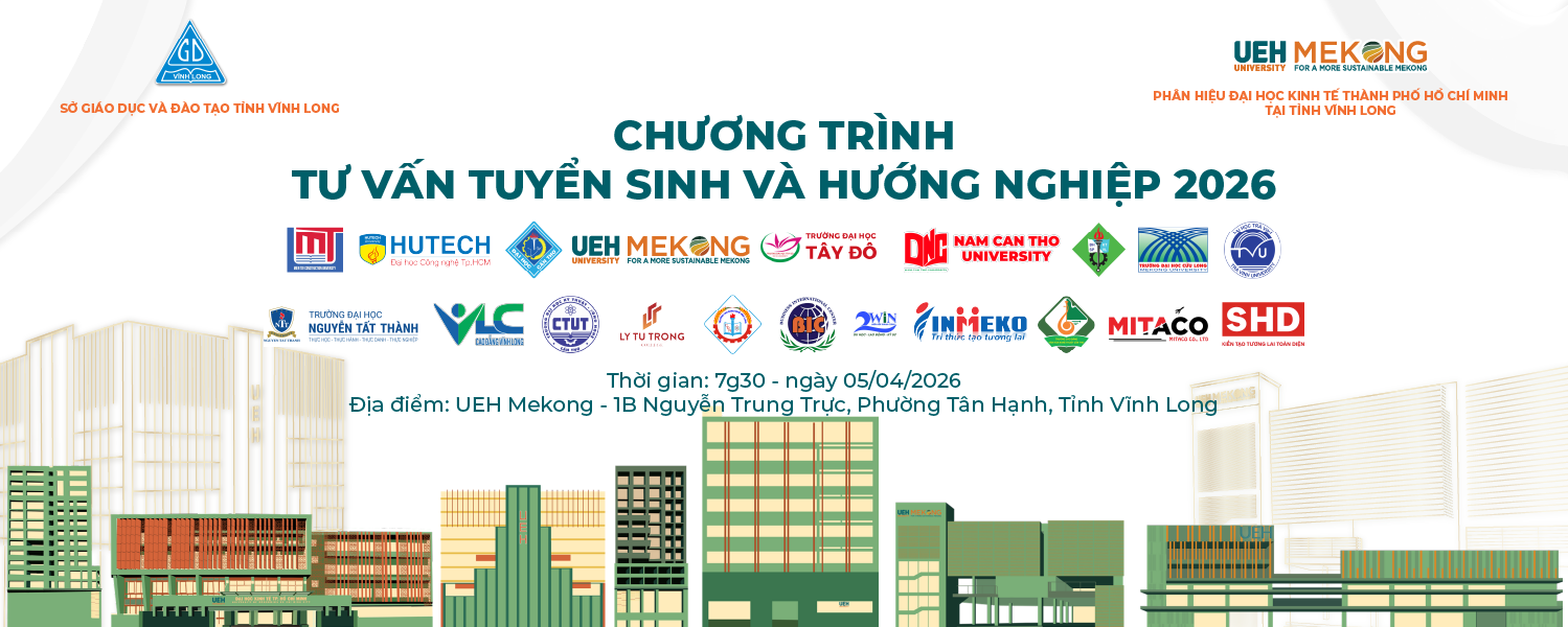 Tiếp nối sứ mệnh đồng hành cùng học sinh khu vực Đồng bằng sông Cửu Long trên hành trình định hướng nghề nghiệp, UEH Mekong phối hợp cùng Sở Giáo dục và Đào tạo Vĩnh Long, đăng cai tổ chức chương trình Ngày hội Tư vấn Tuyển sinh - Hướng nghiệp năm 2026.