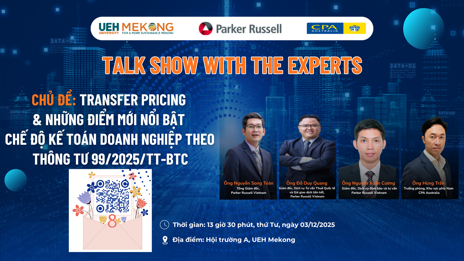 Sự kiện hướng đến giảng viên và sinh viên chính quy Khóa 49, Khóa 50 các ngành Kế Toán, Thuế, Tài chính, Ngân hàng, Quản trị, Marketing, Kinh doanh quốc tế, Kinh Doanh nông nghiệp đang học tập tại UEH Mekong nhằm giải mã xu hướng chuyển giá quốc tế, nắm bắt nhu cầu nguồn nhân lực trong lĩnh vực chuyển giá và cập nhật những điểm mới từ Thông tư số 99/2025/TT-BTC thay thế thông tư 200/2014/TT-BTC về hướng dẫn chế độ kế toán doanh nghiệp, và đồng thời xác định những công việc cần phải hành động đối với sinh viên cũng như cơ sở đào tạo.