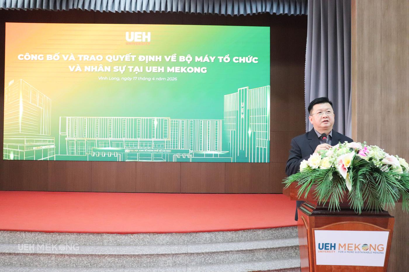 Phát biểu tại buổi lễ, TS. Đinh Công Khải - Phó Giám đốc Đại học nhấn mạnh: “Việc tái cấu trúc là yêu cầu tất yếu để UEH Mekong hội nhập sâu rộng vào hệ thống quản trị chung của UEH. Việc kiện toàn tổ chức là yêu cầu cần thiết góp phần nâng cao hiệu quả quản trị và chất lượng đào tạo. Ban Giám đốc UEH kỳ vọng các viên chức được giao nhiệm vụ sẽ phát huy tinh thần trách nhiệm, năng lực chuyên môn, đặc biệt trong vai trò phụ trách nhóm học phần, góp phần nâng cao chất lượng đào tạo và hiệu quả tuyển sinh. Đồng thời, Ban Giám đốc UEH mong muốn toàn thể viên chức, người lao động tiếp tục chủ động nâng cao năng lực, đáp ứng yêu cầu phát triển trong giai đoạn mới; UEH sẽ luôn quan tâm, ưu tiên nguồn lực để đồng hành cùng UEH Mekong phát triển bền vững”.