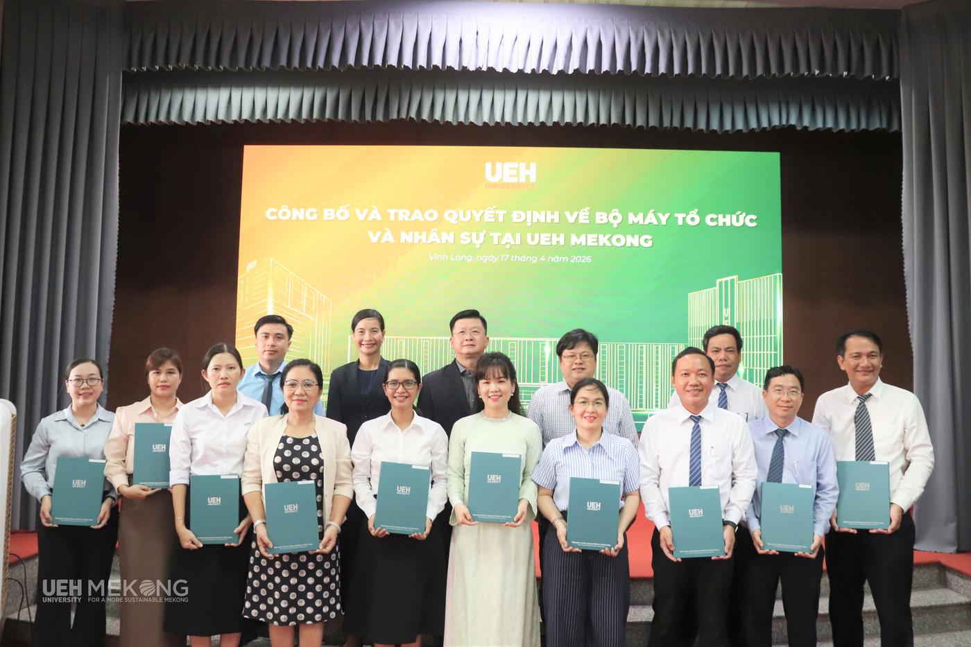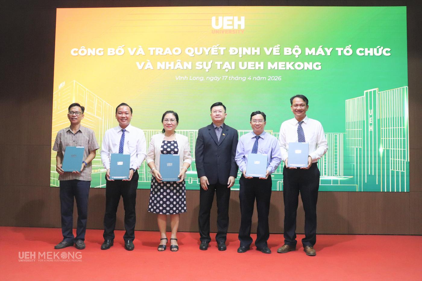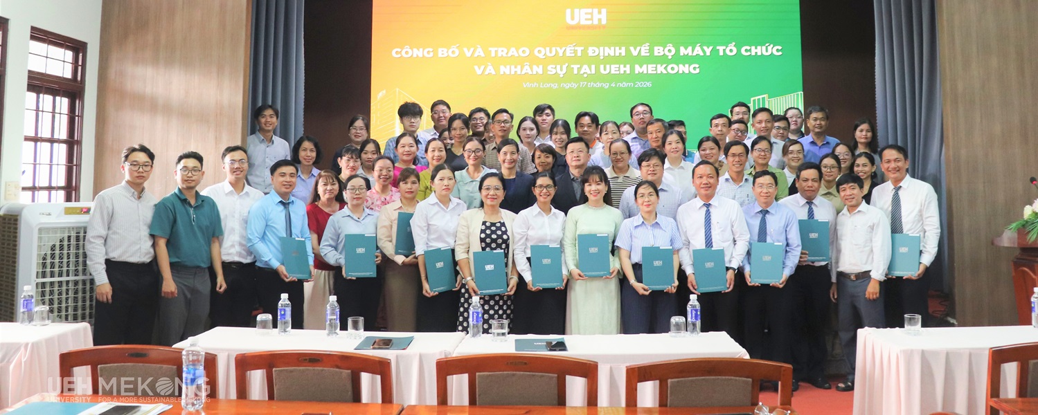 Chiều ngày 17/4/2026, tại Hội trường A3.1, UEH Mekong đã trang trọng tổ chức Lễ công bố và Trao các quyết định của Đại học Kinh tế Thành phố Hồ Chí Minh (UEH) về tổ chức bộ máy và nhân sự theo phương án tái cấu trúc giai đoạn 2026-2030. Sự kiện đánh dấu bước hoàn thiện quan trọng trong tiến trình kiện toàn tổ chức, thể hiện quyết tâm của UEH Mekong trong việc xây dựng mô hình quản trị đại học tinh gọn, nâng cao hiệu lực, hiệu quả hoạt động, tạo nền tảng vững chắc cho giai đoạn phát triển mới gắn với yêu cầu đổi mới và hội nhập.