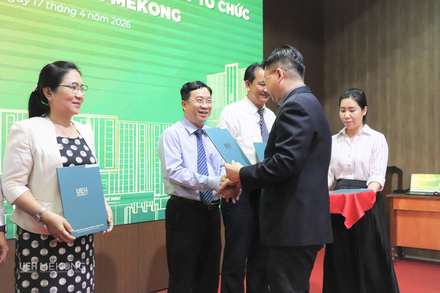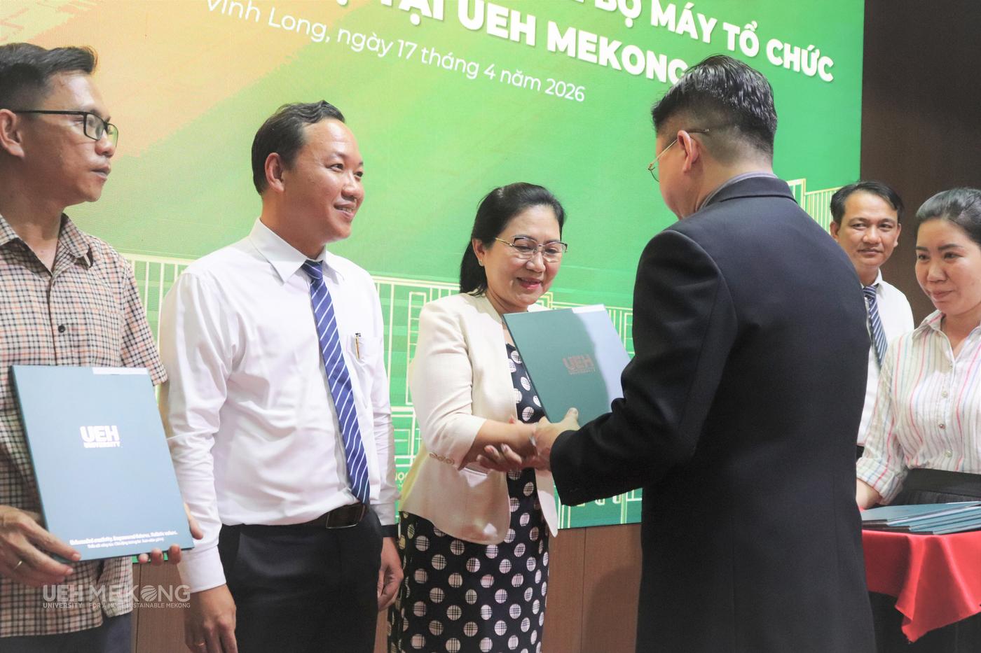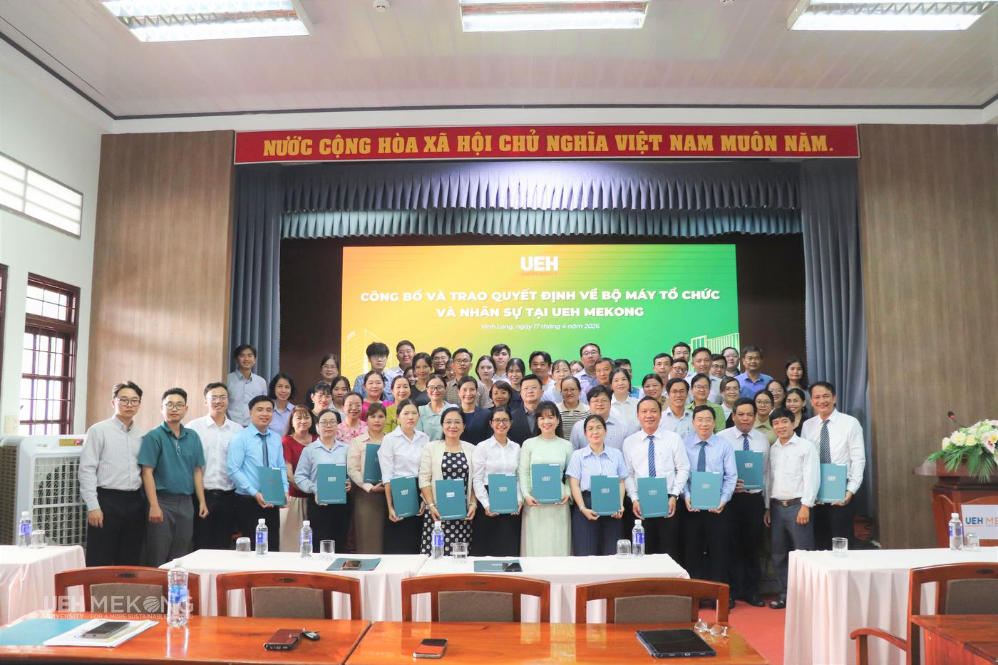 Chiều ngày 17/4/2026, tại Hội trường A3.1, UEH Mekong đã trang trọng tổ chức Lễ công bố và Trao các quyết định của Đại học Kinh tế Thành phố Hồ Chí Minh (UEH) về tổ chức bộ máy và nhân sự theo phương án tái cấu trúc giai đoạn 2026-2030. Sự kiện đánh dấu bước hoàn thiện quan trọng trong tiến trình kiện toàn tổ chức, thể hiện quyết tâm của UEH Mekong trong việc xây dựng mô hình quản trị đại học tinh gọn, nâng cao hiệu lực, hiệu quả hoạt động, tạo nền tảng vững chắc cho giai đoạn phát triển mới gắn với yêu cầu đổi mới và hội nhập.