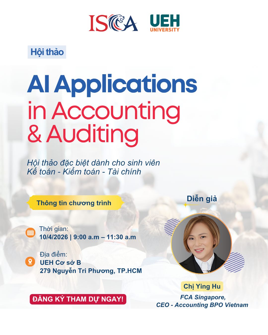 Nhằm hỗ trợ sinh viên cập nhật xu hướng chuyển đổi số trong lĩnh vực kế toán – kiểm toán, Khoa thông tin đến các bạn Hội thảo với chủ đề AI Applications in Accounting & Auditing. Chương trình do Institute of Singapore Chartered Accountants (ISCA) phối hợp cùng Khoa Kế toán tổ chức, mang đến góc nhìn thực tiễn về cách trí tuệ nhân tạo (AI) đang được ứng dụng trong hoạt động kế toán, kiểm toán và tài chính tại doanh nghiệp.