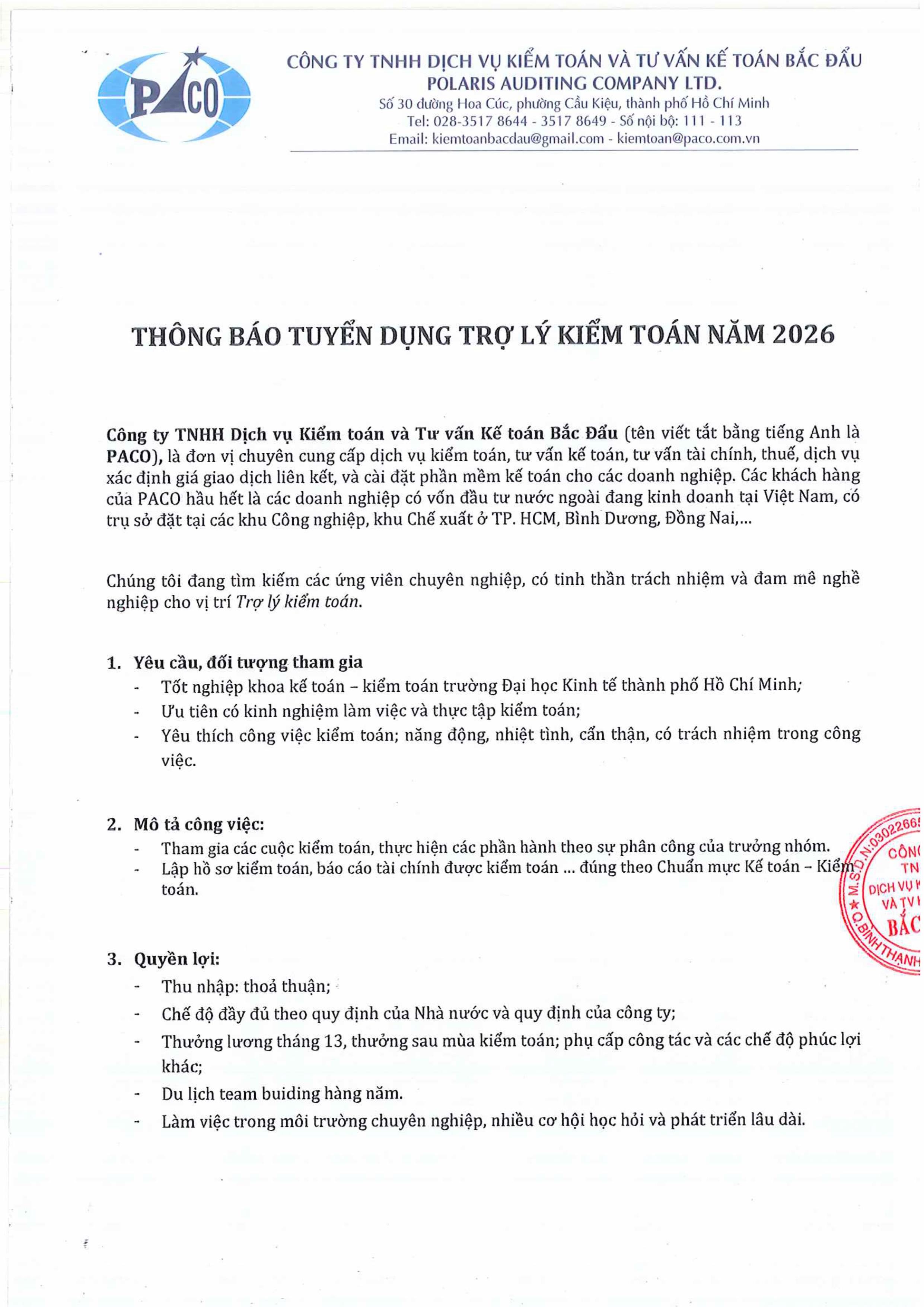 Công ty TNHH Dịch vụ Kiểm toán và Tư vấn Kế toán Bắc Đẩu (tên viết tắt bằng tiếng Anh là PACO), là đơn vị chuyên cung cấp dịch vụ kiểm toán, tư vấn kế toán, tư vấn tài chính, thuế, dịch vụ xác định giá giao dịch liên kết, và cài đặt phần mềm kế toán cho các doanh nghiệp. Các khách hàng của PACO hầu hết là các doanh nghiệp có vốn đầu tư nước ngoài đang kinh doanh tại Việt Nam, có trụ sở đặt tại các khu Công nghiệp, khu Chế xuất ở TP. HCM, Bình Dương, Đồng Nai,… Chúng tôi đang tìm kiếm các ứng viên chuyên nghiệp, có tinh thần trách nhiệm và đam mê nghề nghiệp cho vị trí Trợ lý kiểm toán.