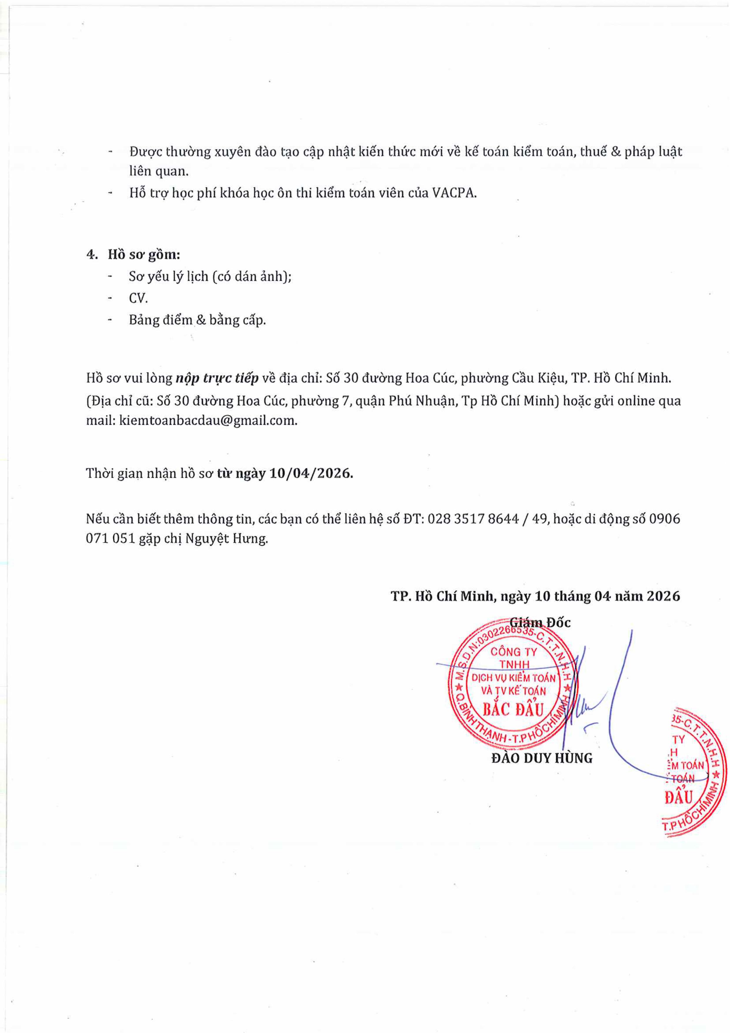 (Địa chỉ cũ: Số 30 đường Hoa Cúc, phường 7, quận Phú Nhuận, Tp Hồ Chí Minh) hoặc gửi online qua mail: kiemtoanbacdau@gmail.com.