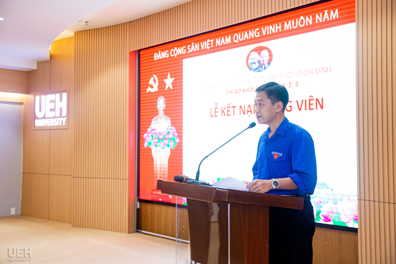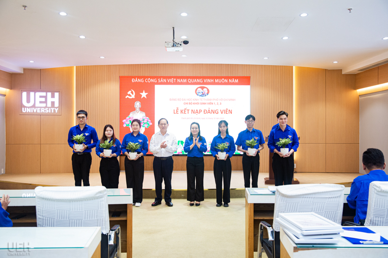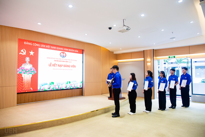 Chiều ngày 30/10/2025, tại Hội trường A.103 cơ sở A, các Chi bộ Khối Sinh viên 1,2,3 thuộc Đảng bộ Đại học Kinh tế Thành phố Hồ Chí Minh (UEH) đã long trọng tổ chức Lễ kết nạp Đảng viên cho 6 đoàn viên ưu tú nhân dịp Kỷ niệm 49 năm thành lập UEH (27/10/1976 - 27/10/2025).