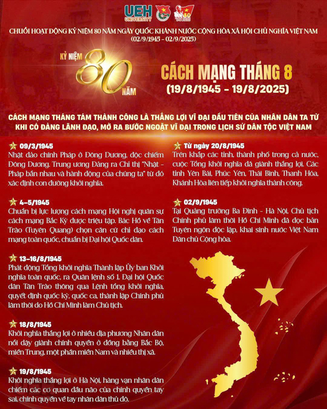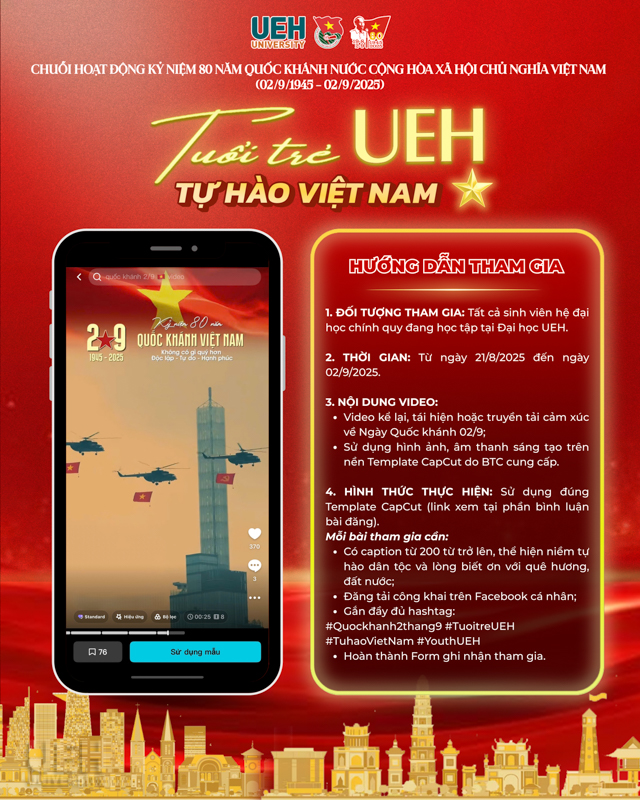 Hướng đến Kỷ niệm 80 năm Quốc khánh nước Cộng hòa Xã hội Chủ nghĩa Việt Nam (02/9/1945 – 02/9/2025), Đoàn Đại học Kinh tế Thành phố Hồ Chí Minh (UEH) đã tổ chức chuỗi hoạt động ý nghĩa với chủ đề “Tuổi trẻ UEH – Tự hào Việt Nam”. Đây là dịp để tuổi trẻ UEH tri ân lịch sử, bồi đắp niềm tự hào dân tộc và khơi dậy khát vọng cống hiến của thế hệ trẻ trong giai đoạn hội nhập, phát triển.