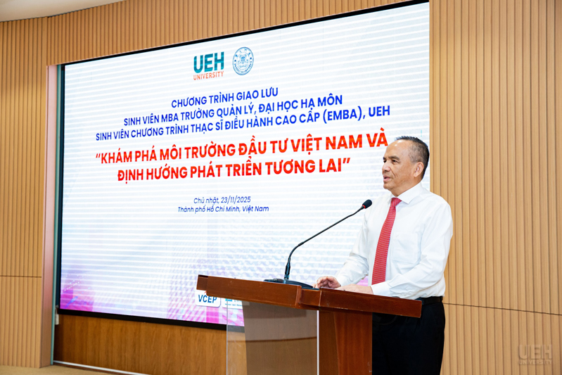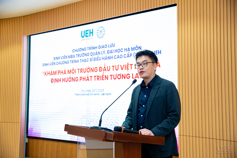 Ngày 23/11/2025 tại cơ sở A, Đại học Kinh tế Thành phố Hồ Chí Minh (UEH) đã tổ chức Chương trình giao lưu quốc tế giữa học viên MBA của Trường Quản lý, Đại học Hạ Môn (XMU) và học viên chương trình Thạc sĩ Điều hành cao cấp (EMBA) của UEH với chủ đề “Khám phá môi trường Đầu tư Việt Nam và Định hướng Phát triển Tương lai”. Sự kiện là diễn đàn trao đổi học thuật và chuyên môn giữa các chuyên gia kinh tế về môi trường kinh doanh và kinh nghiệm đầu tư tại Việt Nam, đồng thời tạo không gian kết nối giữa học viên, doanh nhân hai trường, thúc đẩy giao lưu học thuật và nghề nghiệp.