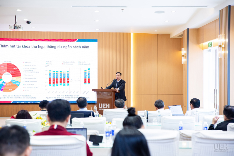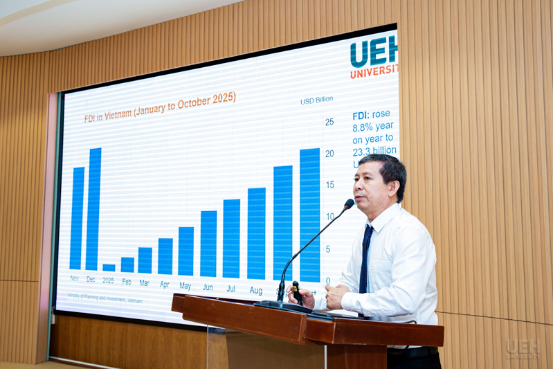 Tiếp sau đó, PGS.TS Từ Văn Bình - Phó Trưởng Ban Đào tạo UEH trình bày báo cáo về tình hình vốn đầu tư trực tiếp nước ngoài (FDI) tại Việt Nam trong những năm qua, cùng các chính sách thu hút FDI trong thời gian tới. Báo cáo cũng chỉ rõ những thuận lợi và thách thức mà Việt Nam đang đối mặt trong quá trình thúc đẩy dòng vốn đầu tư này.