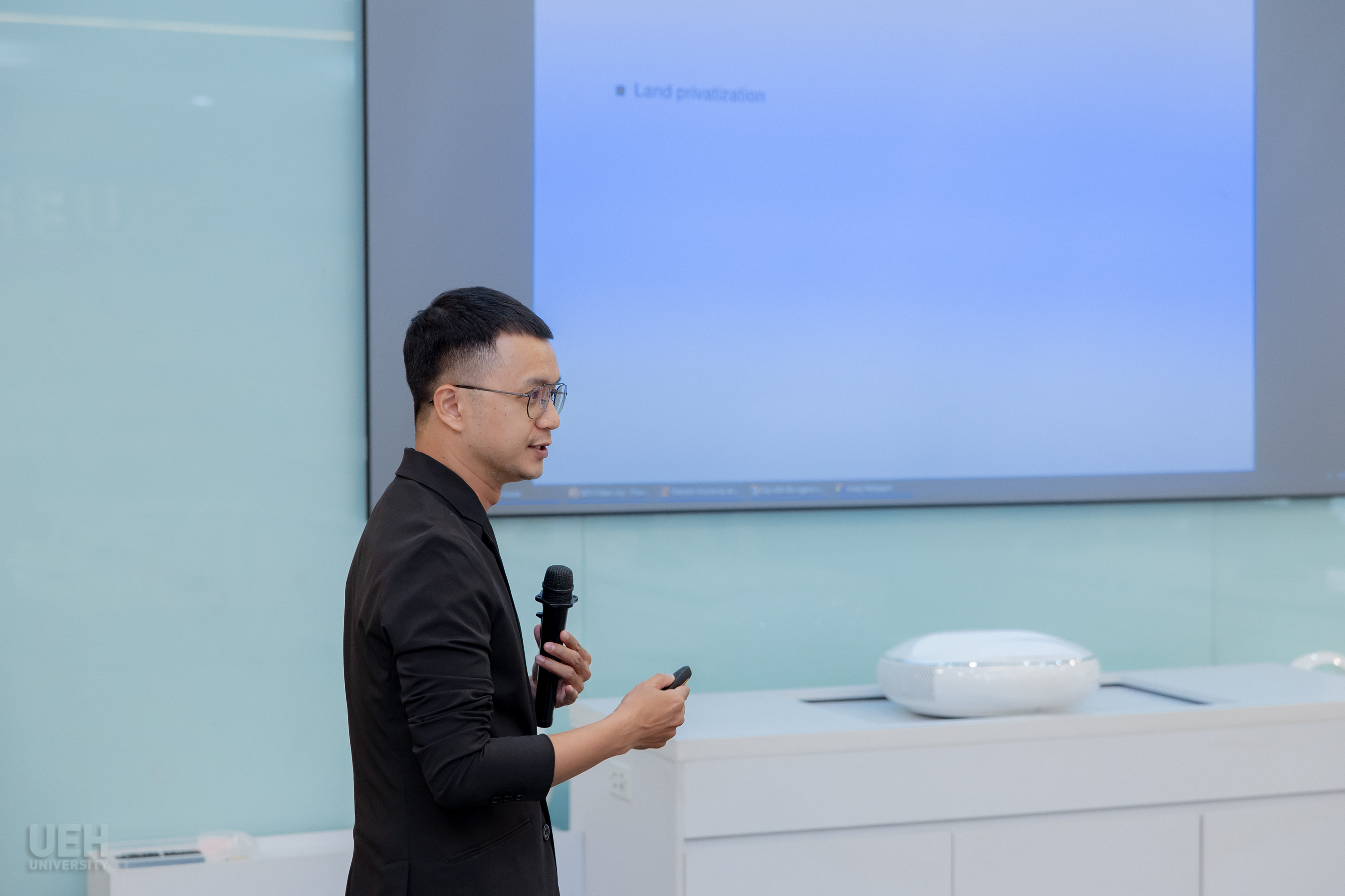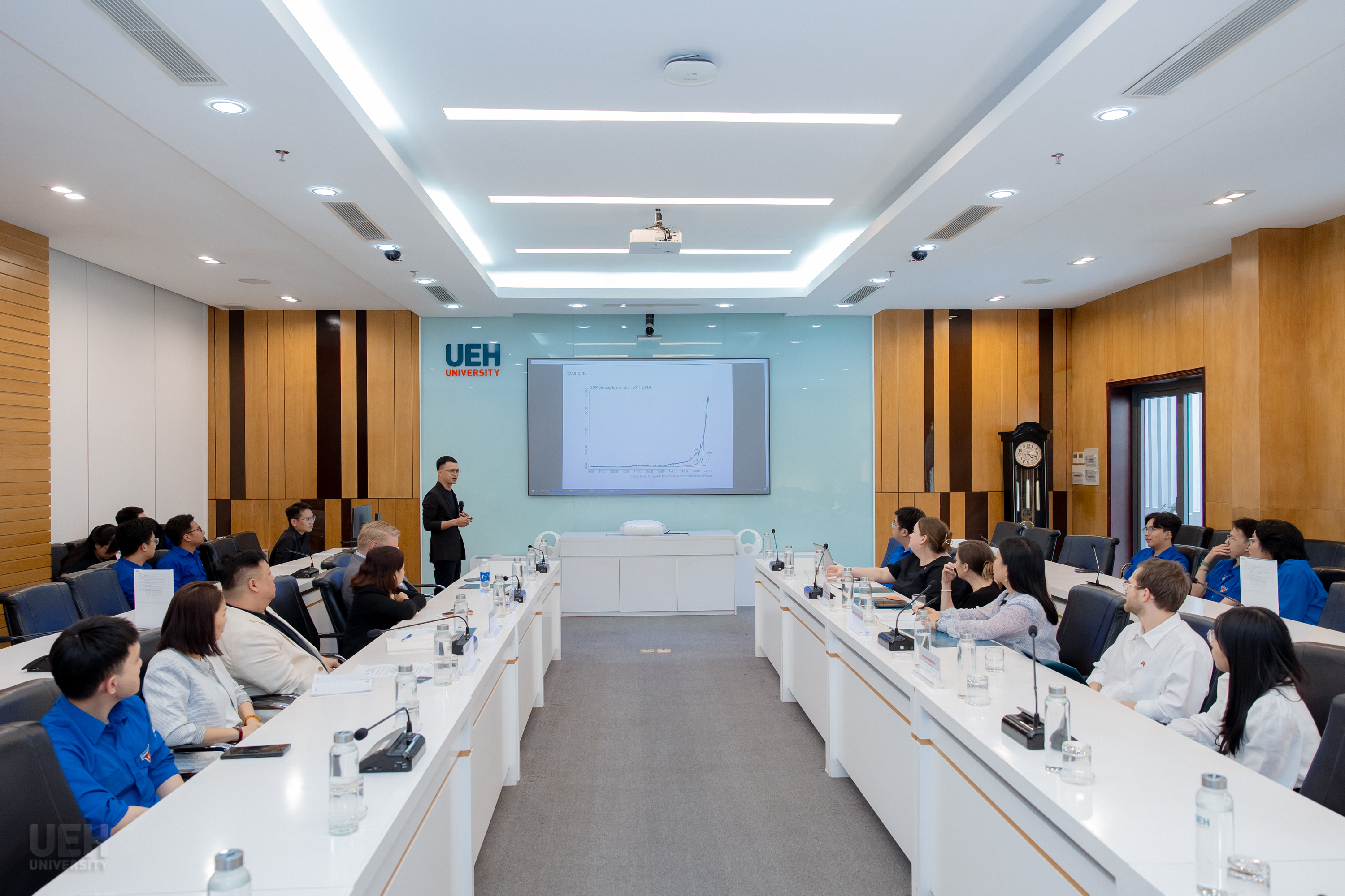 Trong phần trao đổi chuyên môn, TS. Hồ Hoàng Anh - Giám đốc Chương trình Thạc sĩ Kinh tế và Quản trị lĩnh vực sức khỏe đã trình bày bức tranh khái quát về quá trình phát triển kinh tế và giáo dục của Việt Nam trước và sau công cuộc Đổi mới năm 1986. Bài trình bày nhấn mạnh những chuyển biến nổi bật trong giai đoạn hậu Đổi mới, cho thấy sự đầu tư ngày càng rõ nét vào phát triển vốn con người. Các nội dung chia sẻ đã giúp đoàn đại biểu Úc có thêm góc nhìn về mô hình kinh tế và hệ thống giáo dục kinh tế của Việt Nam.