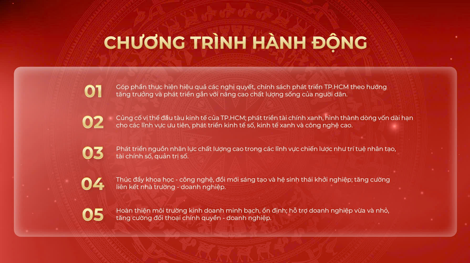 Với thông điệp “Tri thức - Trách nhiệm - Hành động vì một TP.HCM phát triển bền vững và công bằng”, chương trình hành động của ông tập trung vào 5 trụ cột: