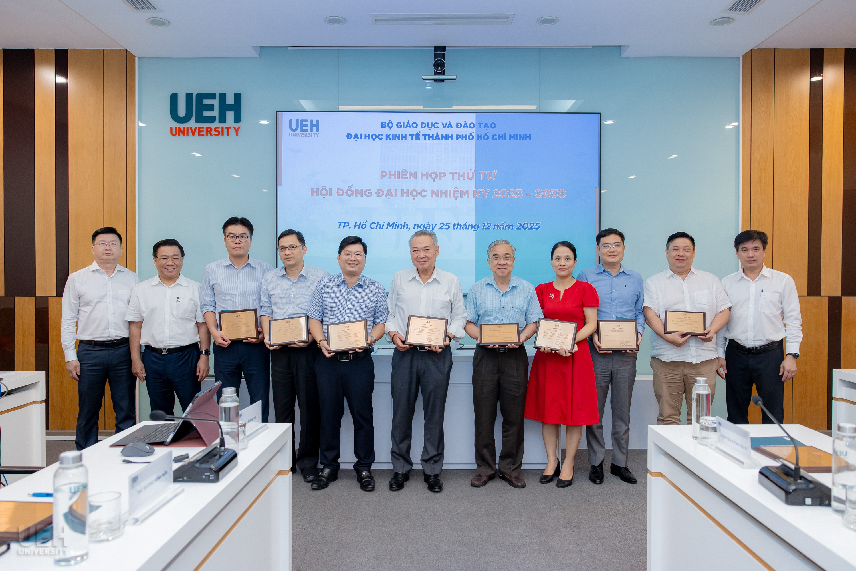 Chiều ngày 25/12/2025, tại phòng A205, Hội đồng đại học Đại học Kinh tế Thành phố Hồ Chí Minh (UEH) nhiệm kỳ 2025-2030 tổ chức Phiên họp thứ Tư theo chương trình làm việc đã được thông qua, đánh dấu giai đoạn hoàn tất các nội dung trọng tâm trong nhiệm kỳ 2025-2030 của Hội đồng đại học.