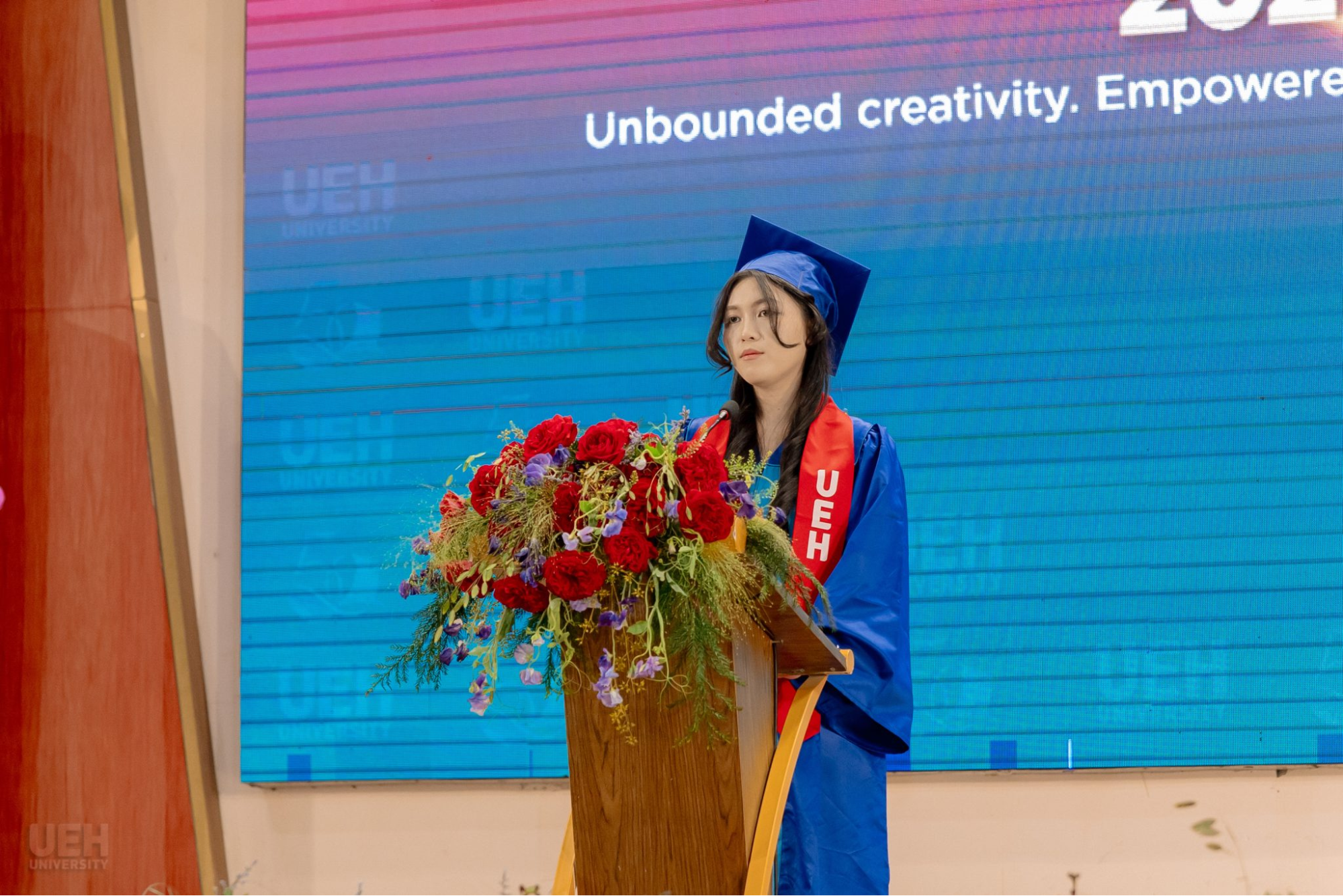 Lễ Tốt nghiệp UEH 2026 vinh dự có sự tham gia của: GS.TS. Nguyễn Khắc Quốc Bảo - Bí thư Đảng ủy; PGS.TS. Bùi Quang Hùng - Phó Giám đốc phụ trách; TS. Đinh Công Khải - Phó Giám đốc; GS.TS. Nguyễn Đông Phong - Chủ tịch Hội đồng Tư vấn chiến lược; GS.TS. Sử Đình Thành - Chủ tịch Hội đồng Khoa học và Đào tạo; PGS.TS. Phan Thị Bích Nguyệt - Chủ tịch Ban Điều hành UEH Alumni; Ban Giám hiệu các Trường thành viên thuộc UEH; các Giáo sư, Phó Giáo sư, Tiến sĩ; Trưởng, Phó các đơn vị trực thuộc UEH và Trường thành viên.