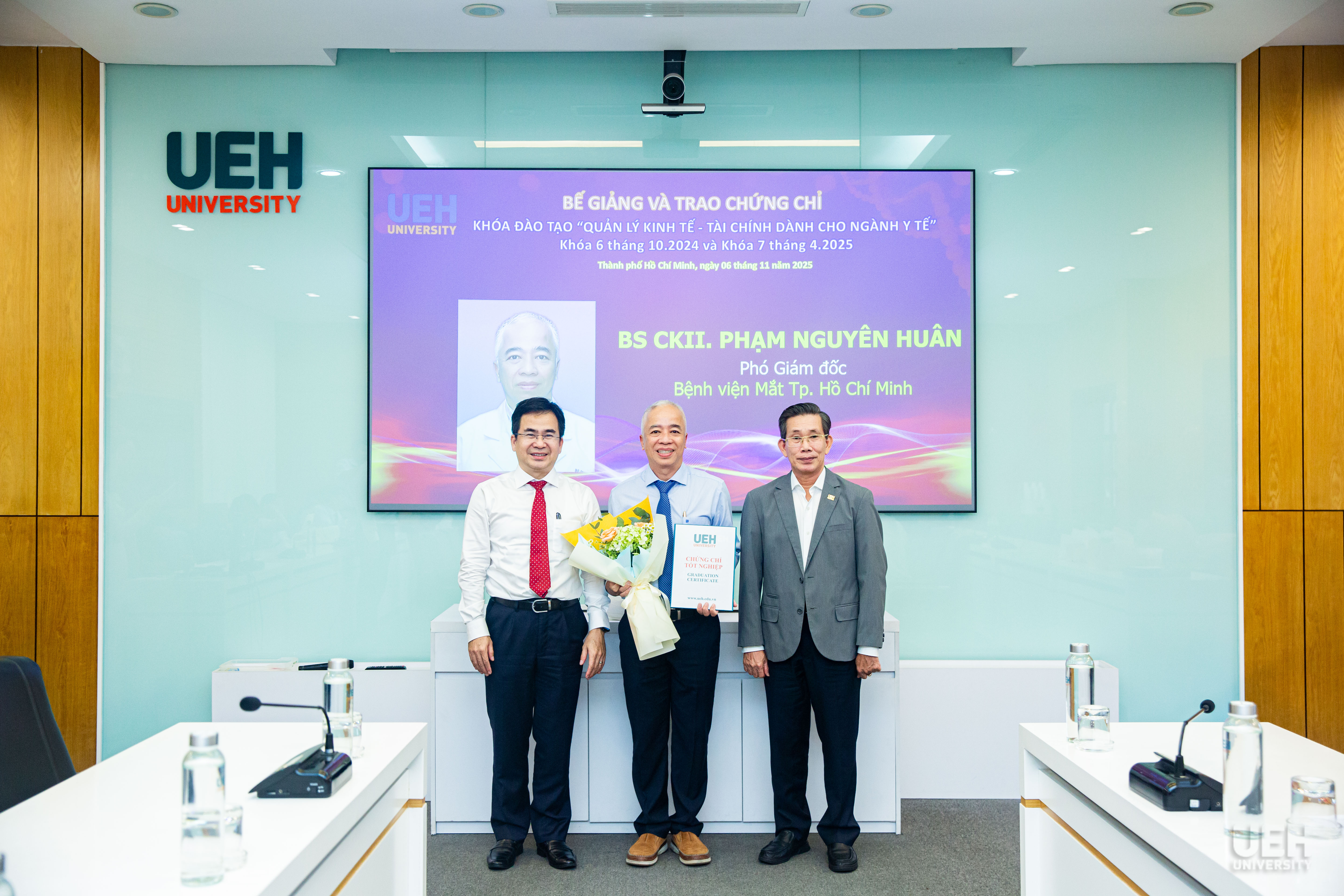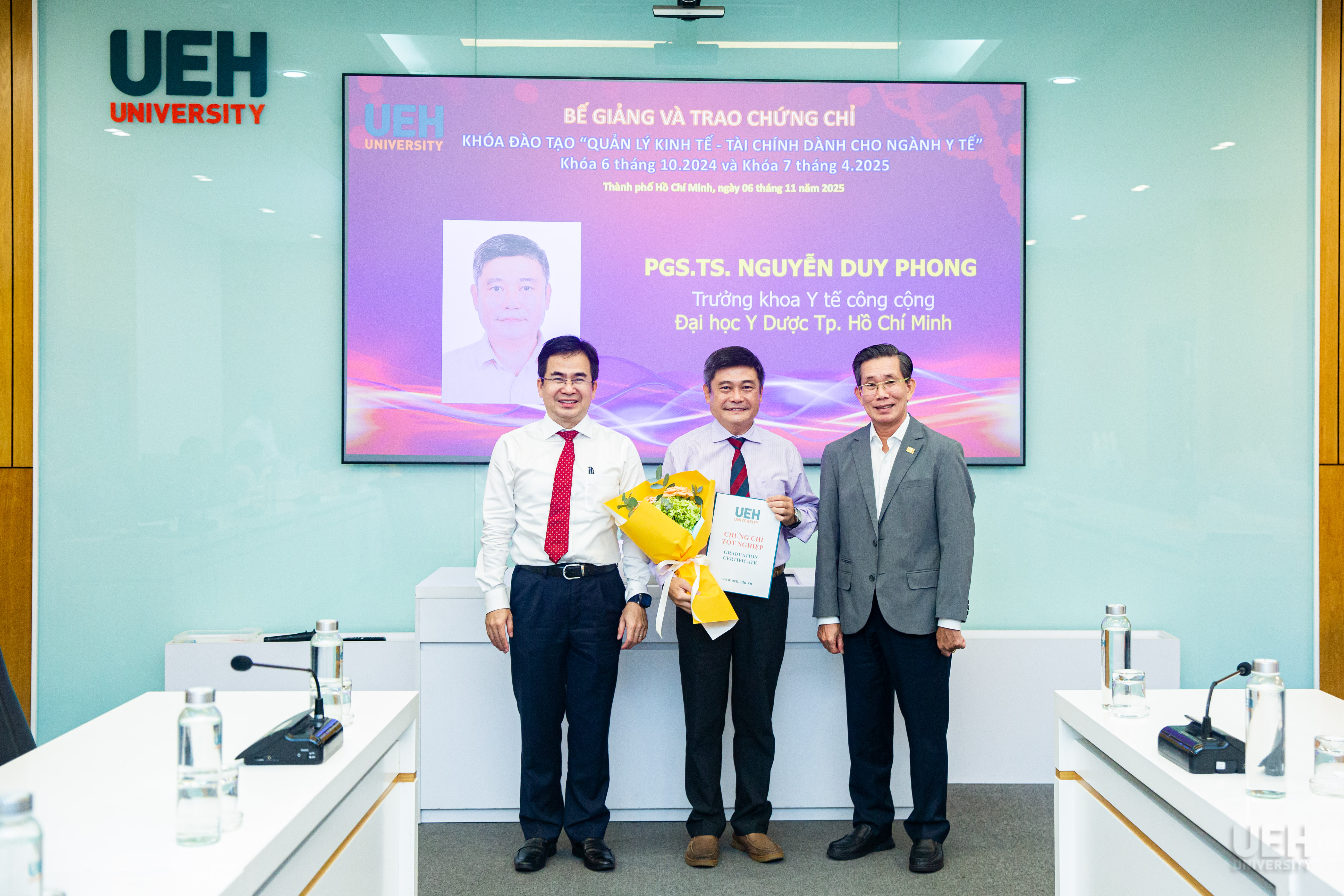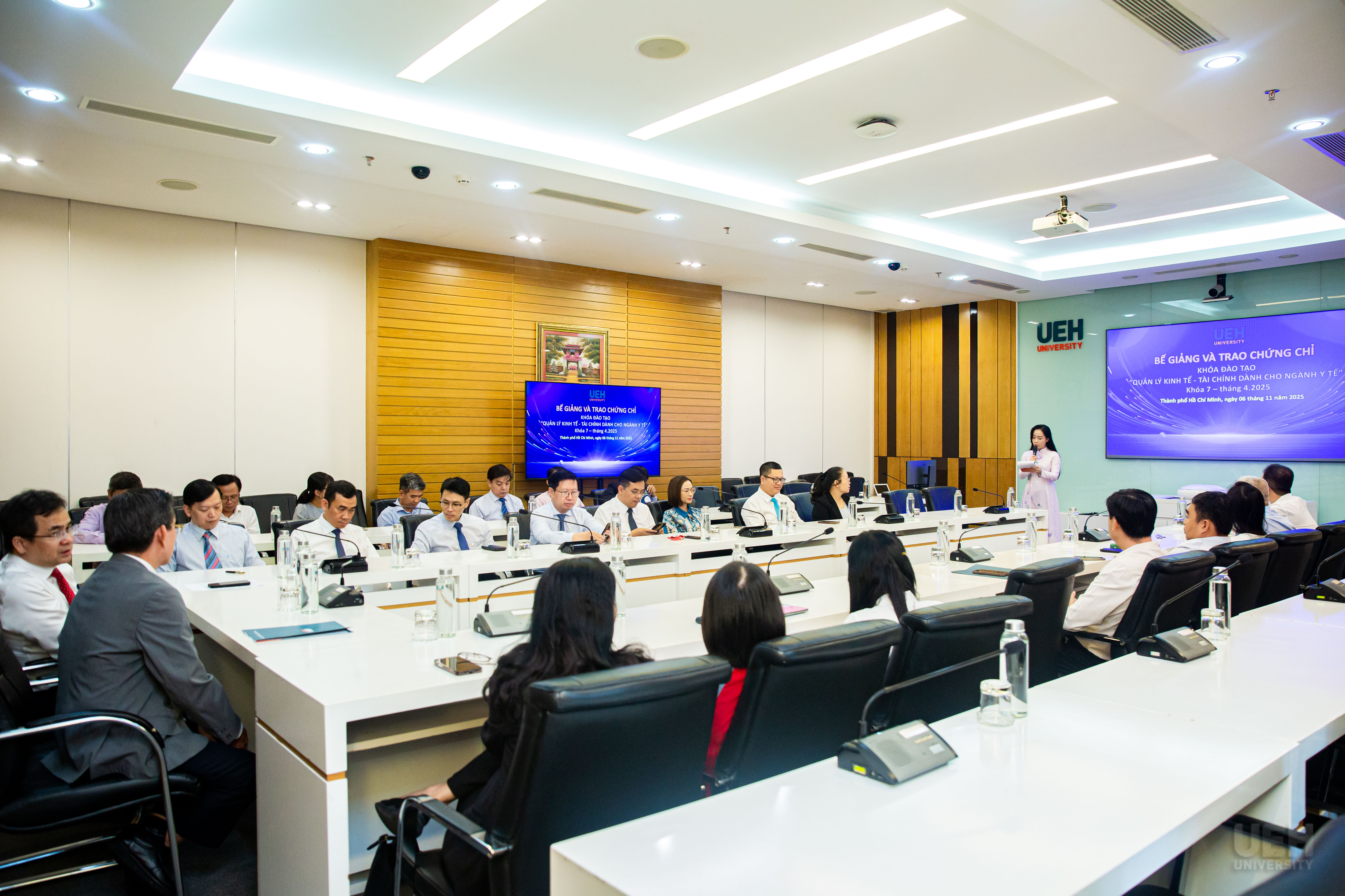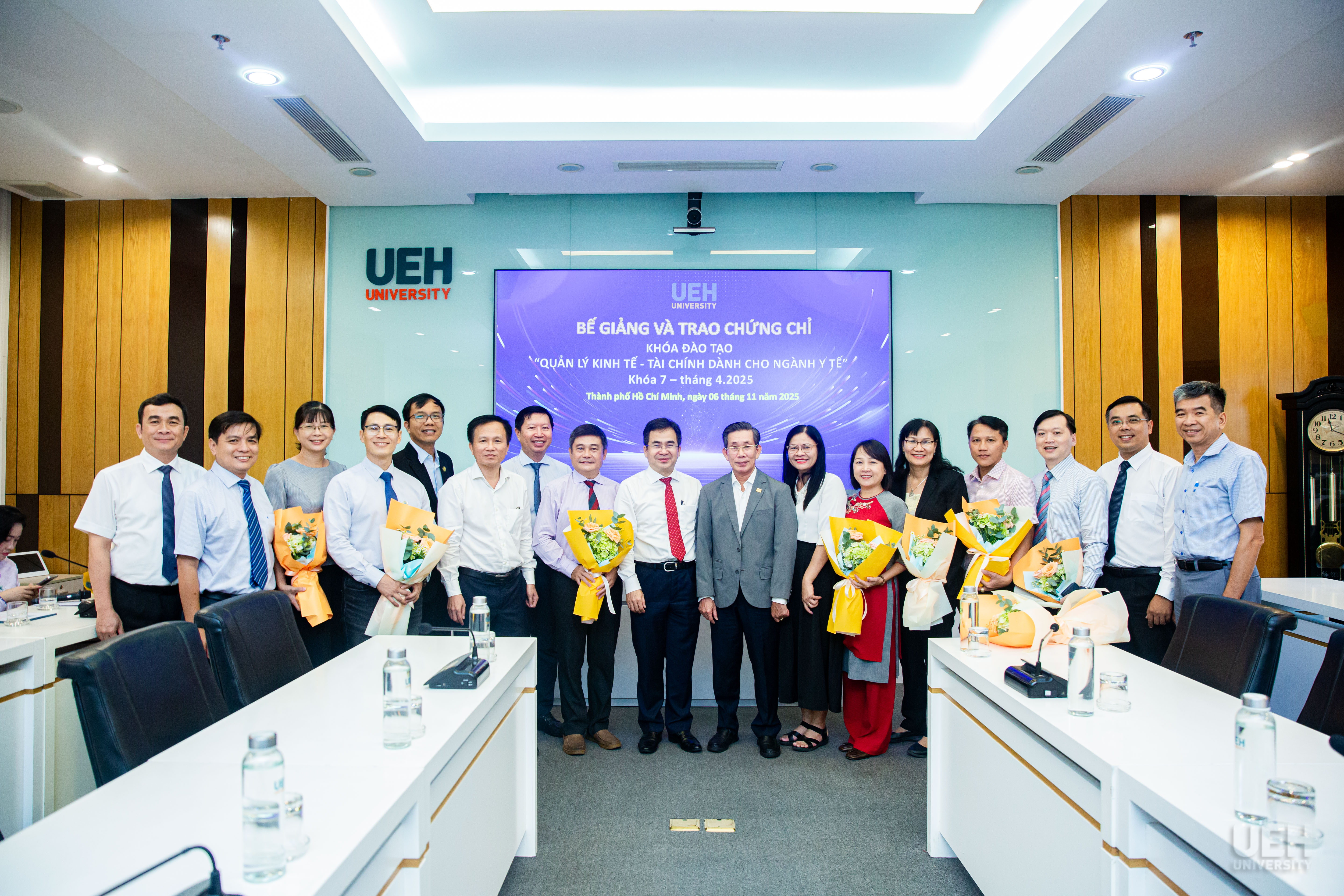 Sáng ngày 06/11/2025, tại phòng A205 – cơ sở 59C Nguyễn Đình Chiểu, Đại học Kinh tế Thành phố Hồ Chí Minh (UEH) đã long trọng tổ chức Lễ Bế giảng và trao chứng chỉ Khóa bồi dưỡng “Quản lý kinh tế - tài chính dành cho ngành Y tế” Khóa 7 - đợt tháng 4/2025.