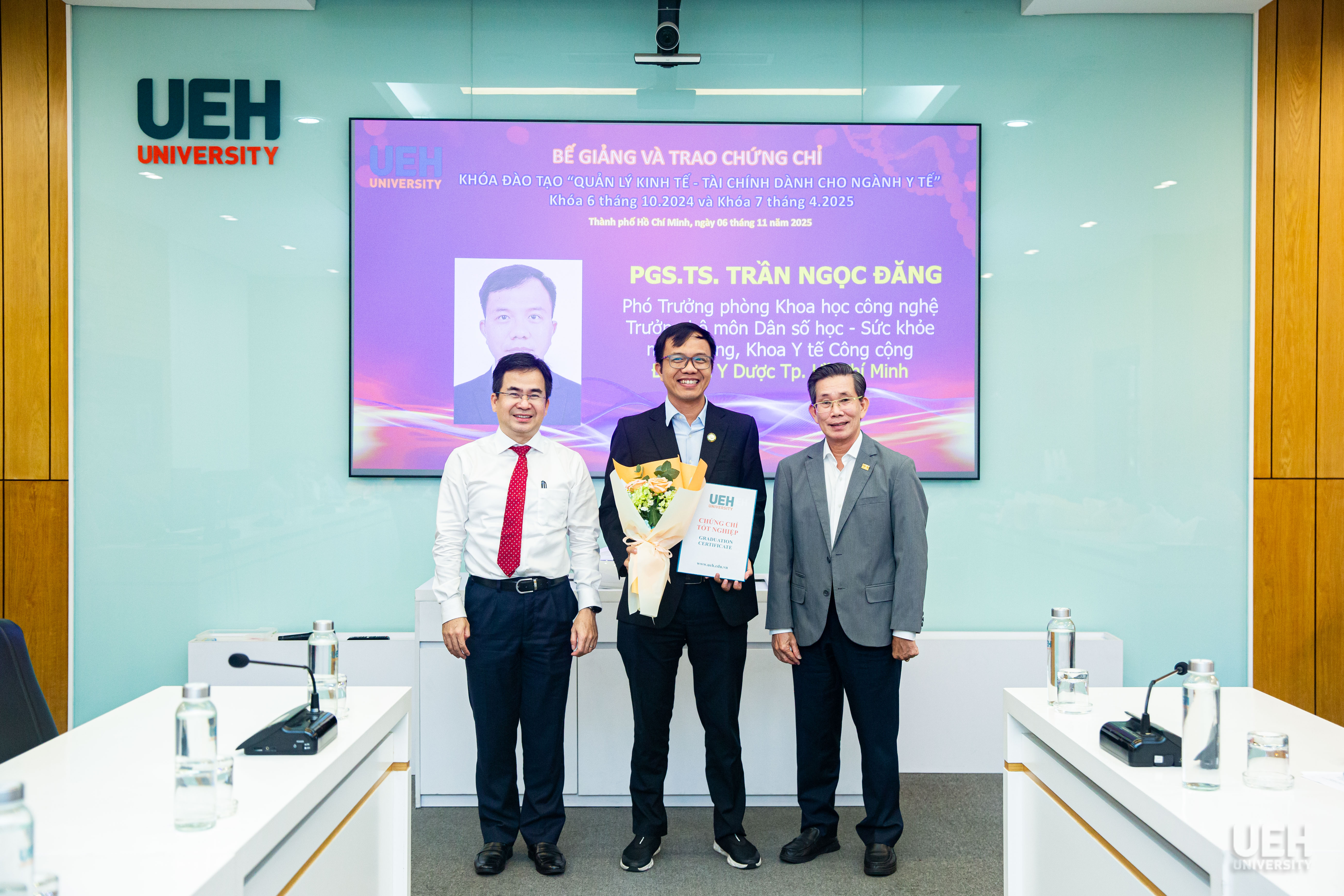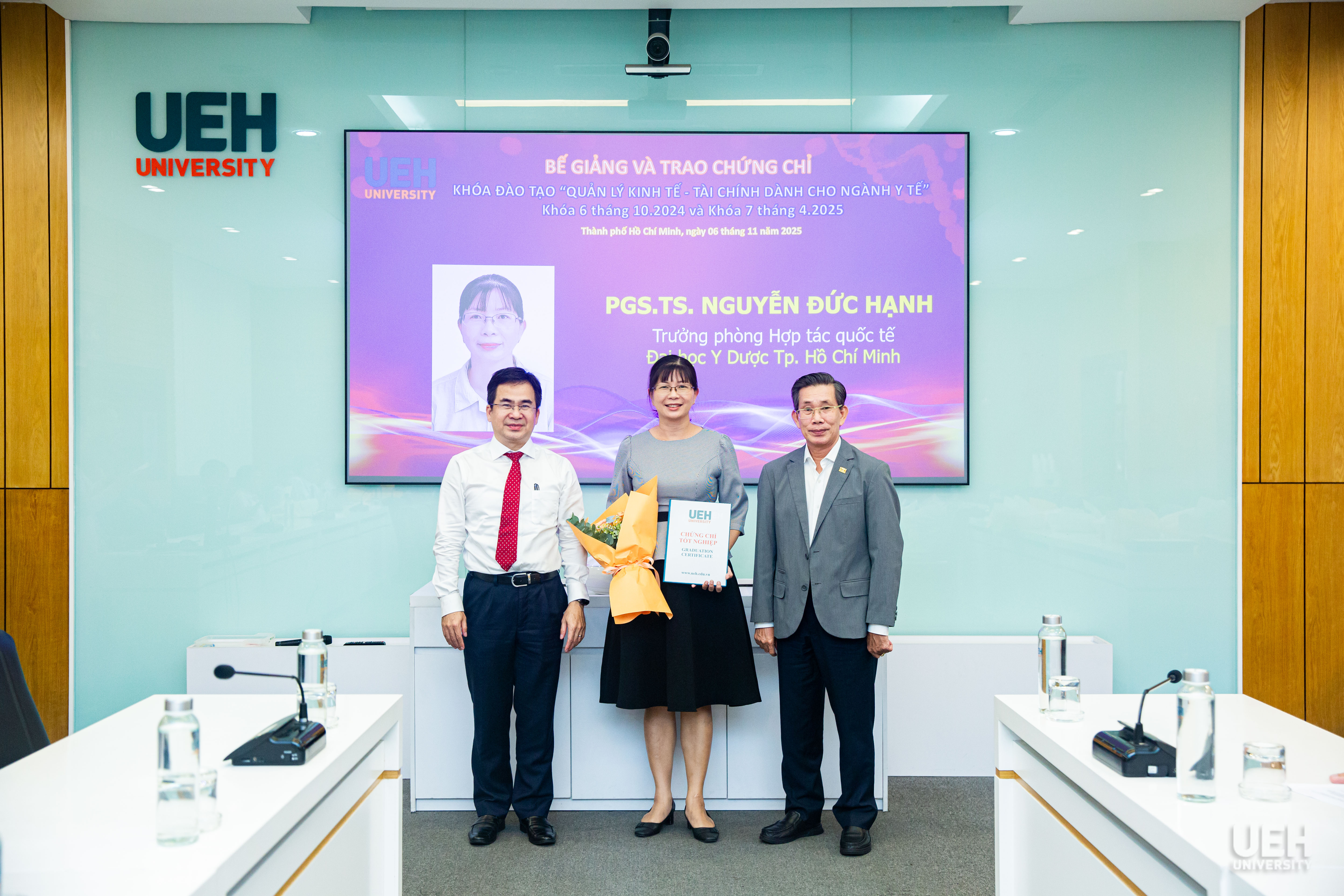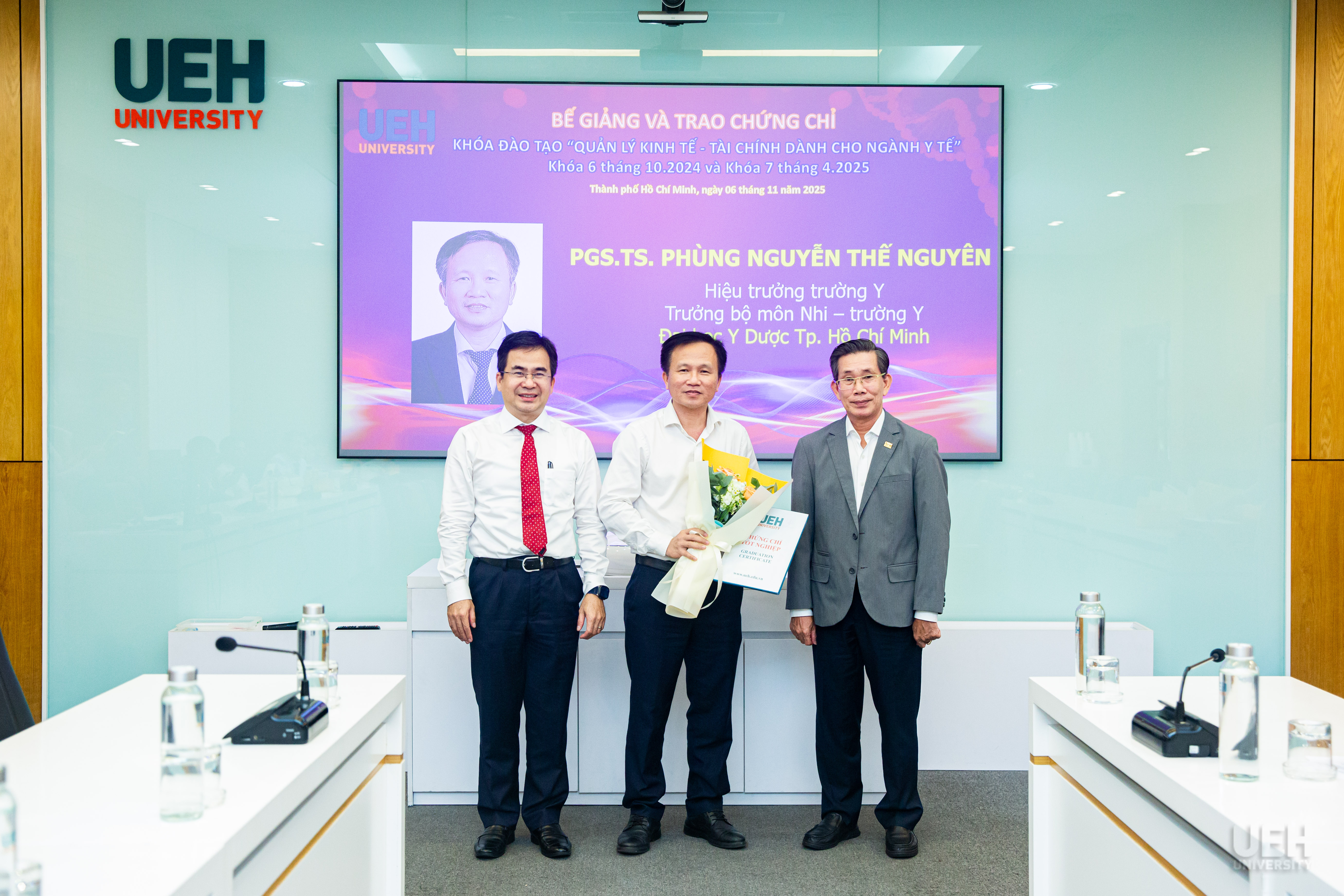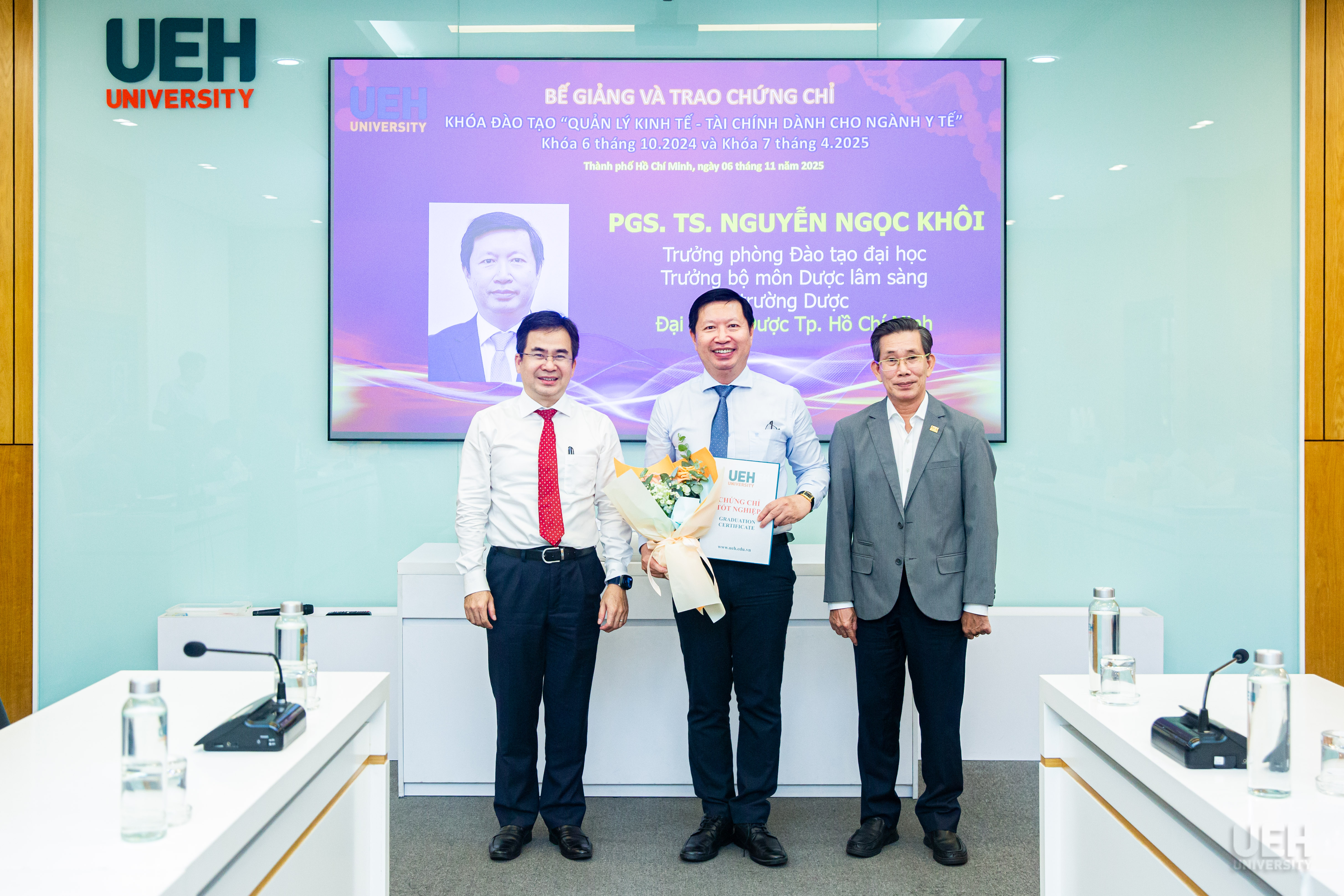 Sáng ngày 06/11/2025, tại phòng A205 – cơ sở 59C Nguyễn Đình Chiểu, Đại học Kinh tế Thành phố Hồ Chí Minh (UEH) đã long trọng tổ chức Lễ Bế giảng và trao chứng chỉ Khóa bồi dưỡng “Quản lý kinh tế - tài chính dành cho ngành Y tế” Khóa 7 - đợt tháng 4/2025.