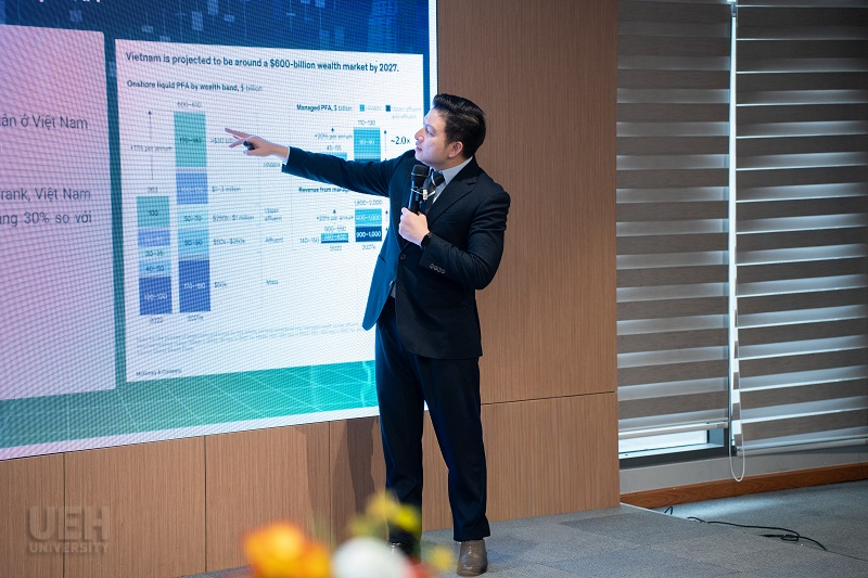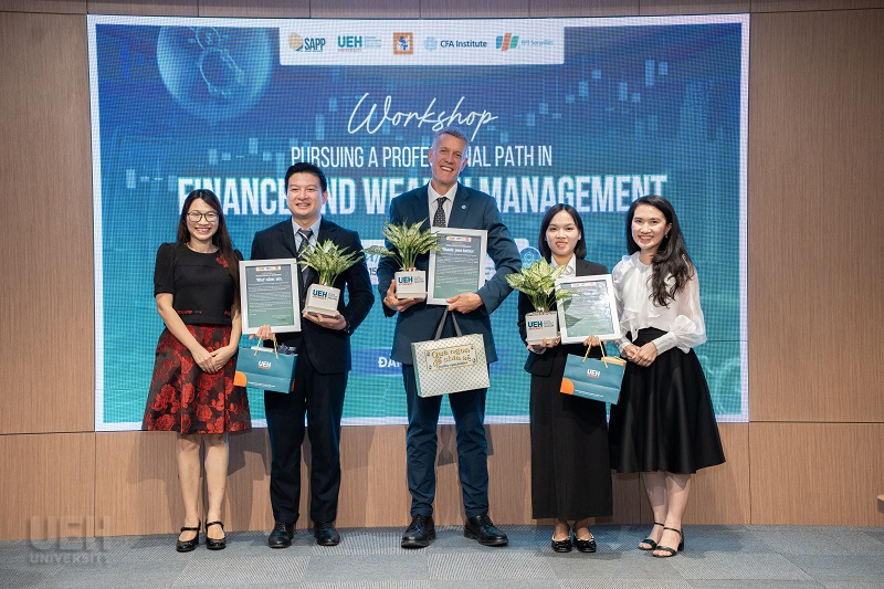 Sau phần lễ, chương trình tiếp tục với buổi seminar chuyên đề “Pursuing a Professional Path in Finance and Wealth Management – Định hướng và phát triển nghề nghiệp chuyên môn trong lĩnh vực Tài chính & Quản trị Gia sản”, được phối hợp tổ chức bởi Khoa Tài chính – Trường Kinh doanh UEH, SAPP Academy và CFA Institute, cùng sự đồng hành chuyên môn từ Công ty Chứng khoán FPTS. Sự kết hợp này mang đến cho sinh viên một chương trình học thuật cập nhật, thực tiễn và tiệm cận chuẩn mực quốc tế, giúp người học có thêm góc nhìn toàn diện về xu hướng nghề nghiệp trong lĩnh vực tài chính.
