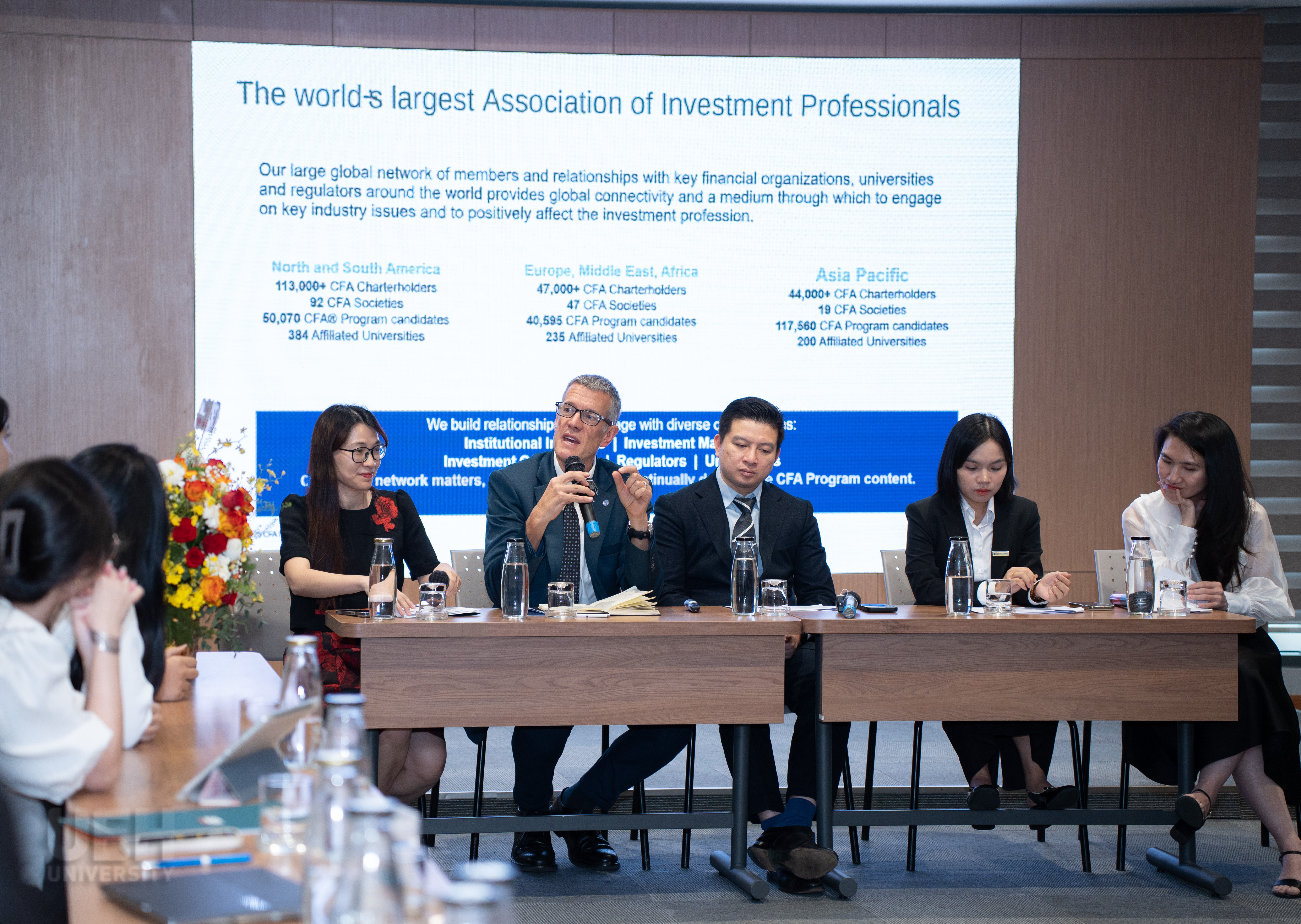 Về phía khách mời từ đơn vị đối tác: Ông Richard McGillivray – Giám đốc cấp cao, khu vực Châu Á Thái Bình Dương, Viện CFA Hoa Kỳ; Bà Florence Wong – Giám đốc Giải pháp Đối tác và Khách hàng, khu vực Châu Á Thái Bình Dương, Viện CFA Hoa Kỳ và Bà Lê Thị Kiều Oanh – Trưởng phòng Tư vấn Đầu tư - Khối Phân tích & Tư vấn đầu tư, Công ty chứng khoán FPT (FPTS).
