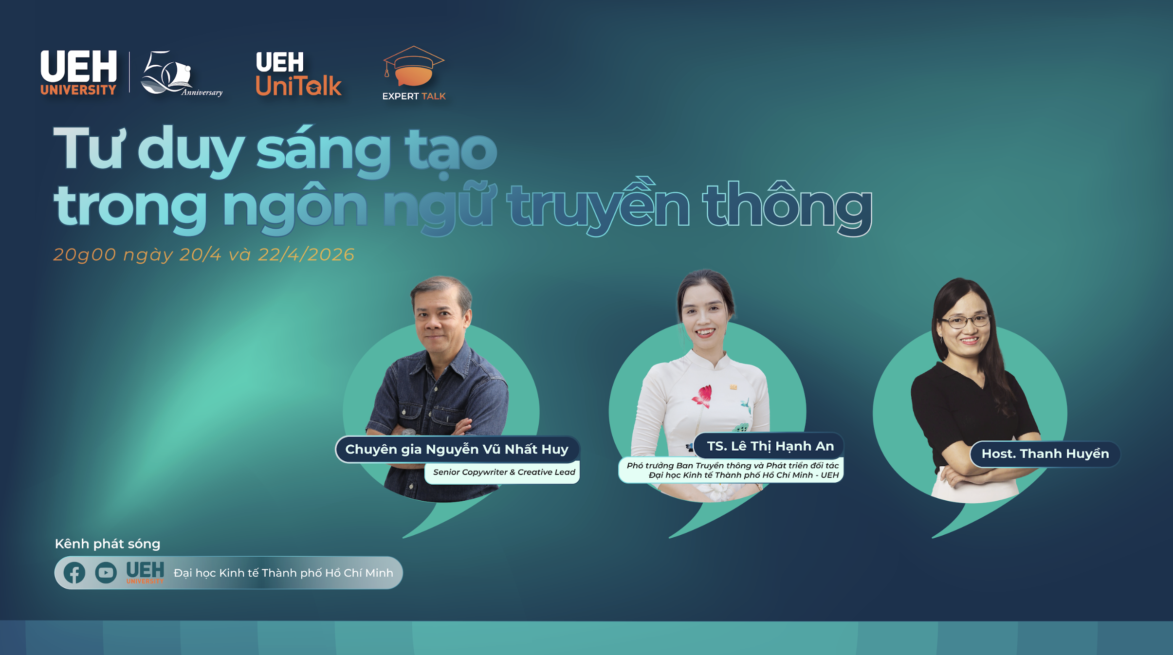 Cùng lắng nghe những giải đáp từ Ông Nguyễn Vũ Nhất Huy – chuyên gia sáng tạo quảng cáo & truyền thông với hơn 25 năm kinh nghiệm và TS. Lê Thị Hạnh An - Phó trưởng Ban Truyền thông và Phát triển đối tác UEH về chủ đề “Tư duy sáng tạo trong ngôn ngữ truyền thông” tại Expert Talk tập 8. Live talk được phát sóng trên hệ thống kênh YouTube UEH Channel: https://go.ueh.edu.vn/ExpertTalk .Với những nội dung hấp dẫn: