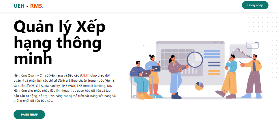 Định hướng chuyển đổi số trong môi trường giáo dục, UEH đã triển khai Hệ thống Dashboard tích hợp, quản trị và đồng bộ dữ liệu được chủ trì xây dựng bởi Ban Nghiên cứu, Phát triển và Gắn kết Toàn cầu. Đây là giải pháp lần đầu tiên được triển khai tại UEH, cho phép tích hợp các nguồn dữ liệu vốn phân tán tại nhiều đơn vị vào một nền tảng dùng chung phục vụ công tác quản trị, báo cáo và điều hành. Hệ thống được thiết kế dựa trên nhu cầu đặc thù của Nhà trường, đồng thời có khả năng mở rộng linh hoạt cho các lĩnh vực quản trị đại học khác trong tương lai.