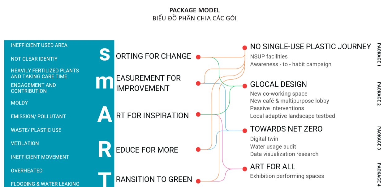 Mô hình smART Hub Living Lab được thiết kế với 4 gói hành động trọng tâm: No Single-Use Plastic Journey (Hành trình ngưng dùng nhựa một lần), Glocal Design (Thiết kế gắn kết toàn cầu và địa phương), Towards Net Zero (Hướng đến phát thải ròng bằng 0) và Art for All (Nghệ thuật cho tất cả), nhằm giải quyết đồng bộ các vấn đề về không gian, tài nguyên, môi trường và trải nghiệm trong khuôn viên đại học theo hướng đô thị thông minh.