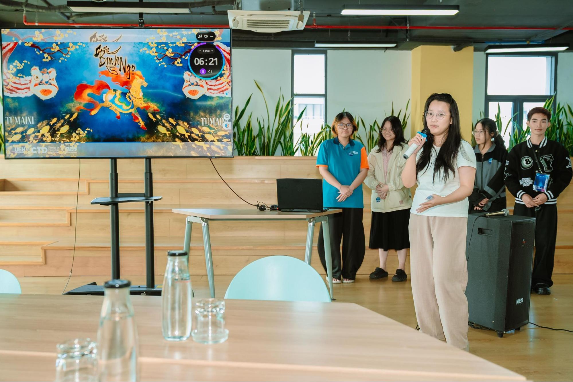 Showcase Sáng tạo là dấu ấn khẳng định triết lý đào tạo gắn kết học thuật và thực hành mà UEH theo đuổi. Tại đây, sinh viên giới thiệu và trình diễn các sản phẩm liên ngành được hình thành từ nhiều học phần như thiết kế, truyền thông đa phương tiện, video, animation,và storytelling. Nổi bật là các ý tưởng kết hợp công nghệ, tiêu biểu những tấm thiệp ứng dụng thực tế tăng cường (AR - Augmented Reality) được trưng bày trên không gian cây tương tác, mang đến trải nghiệm trực quan sinh động. Song song đó, hoạt động Spring Tree - không gian gắn thiệp chúc Tết đã tạo điều kiện để sinh viên gửi gắm thông điệp tích cực về kết nối, sẻ chia và hy vọng, góp phần lan tỏa giá trị Tết cổ truyền trong môi trường đại học hiện đại.