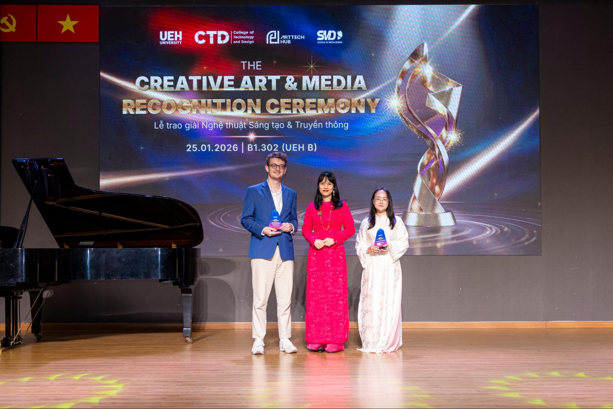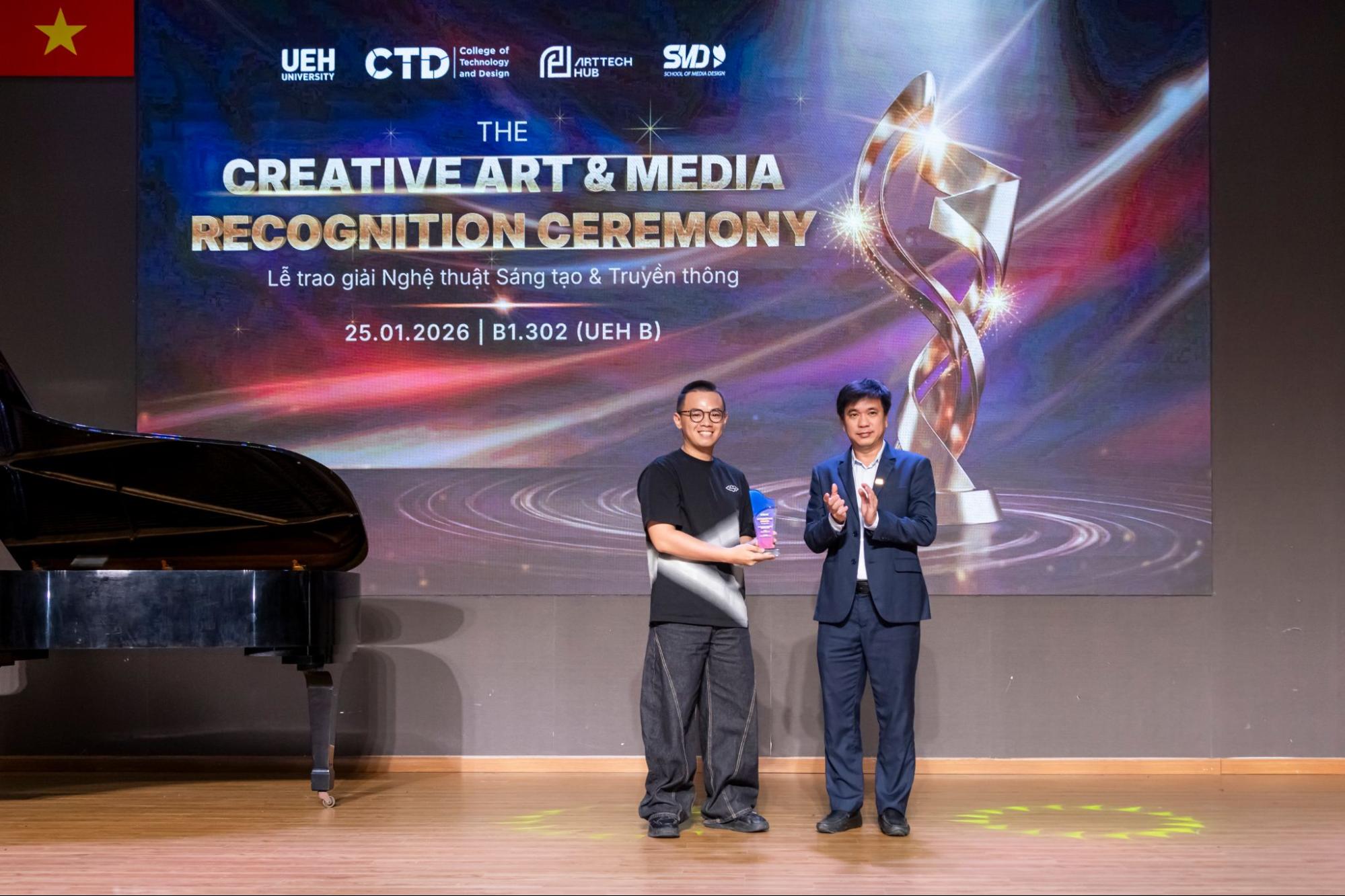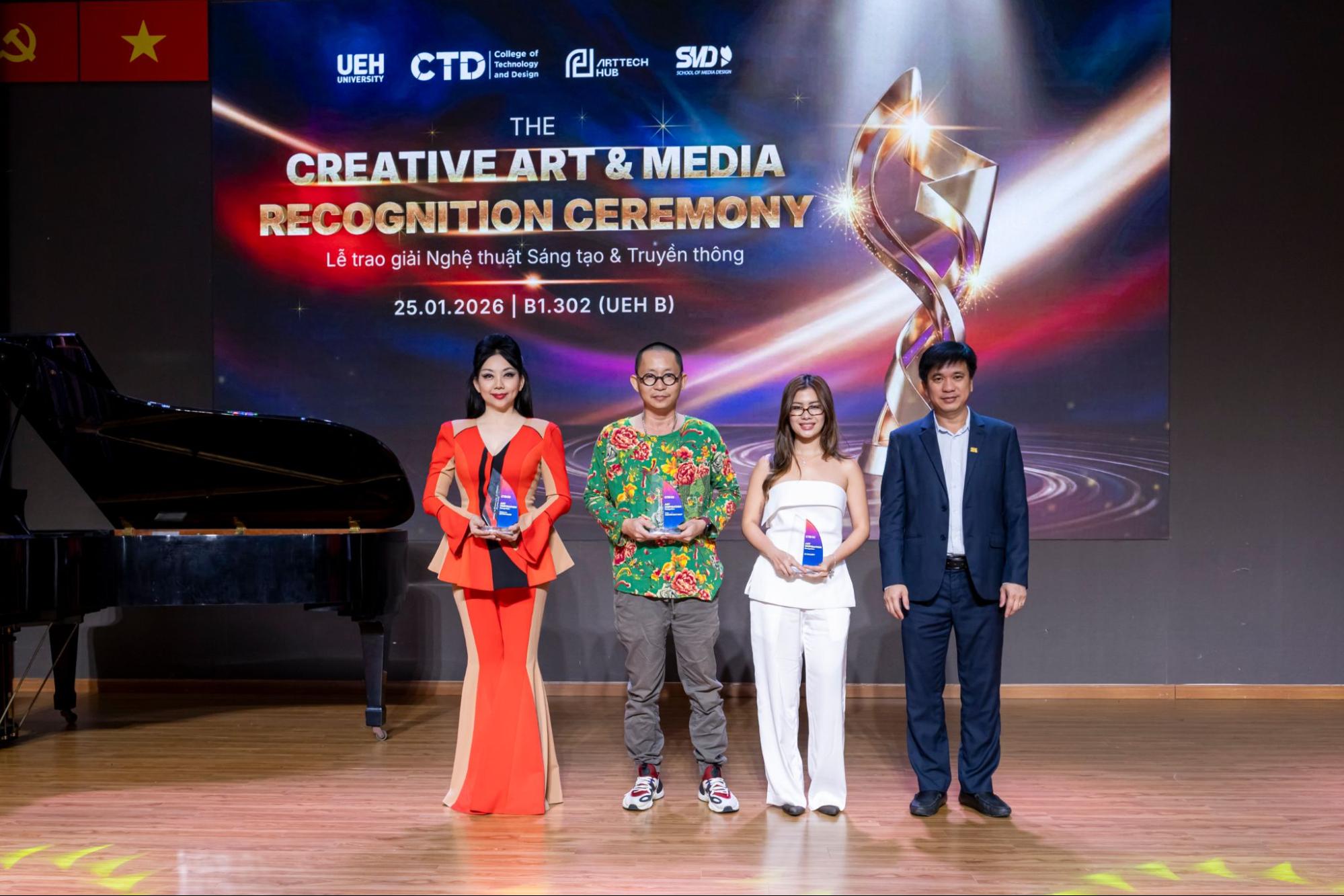 Lễ Vinh danh Sáng tạo Nghệ thuật và Truyền thông khép lại chuỗi sự kiện Tết Art 2026 do Trường Công nghệ và Thiết kế UEH (CTD) đồng phối hợp tổ chức cùng ArtTech Hub và Khoa Thiết kế Truyền thông (SMD). Đây là dấu mốc quan trọng nhằm tổng kết, ghi nhận và lan tỏa những đóng góp tiêu biểu của các nghệ sĩ, những cá nhân truyền cảm hứng và sinh viên trong lĩnh vực nghệ thuật, truyền thông và công nghệ trong năm học vừa qua, khẳng định vai trò của sáng tạo như một động lực thúc đẩy giá trị học thuật và phát triển bền vững trong môi trường đại học.