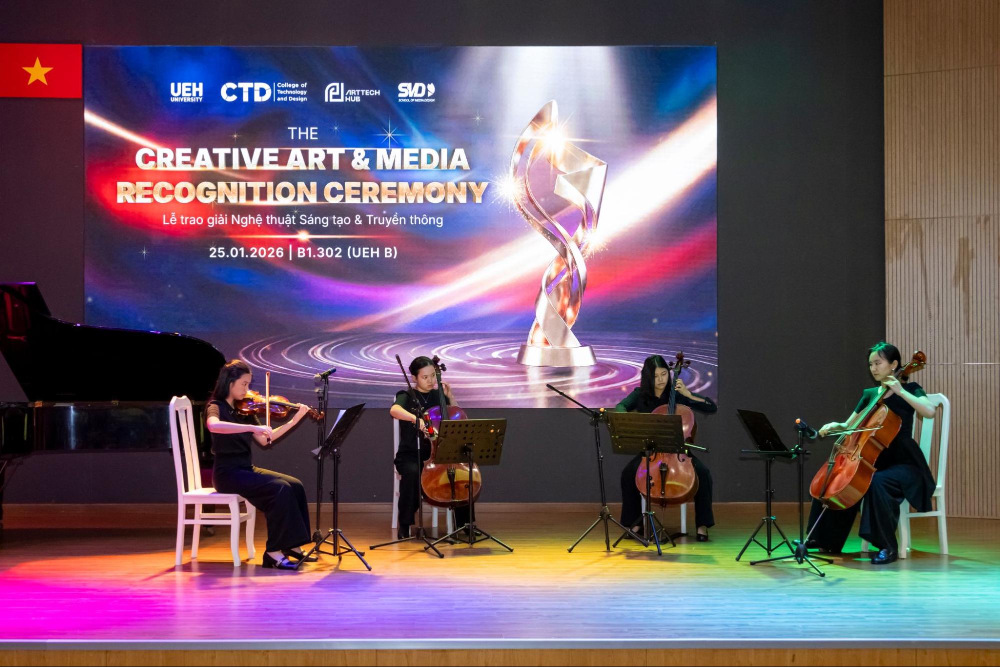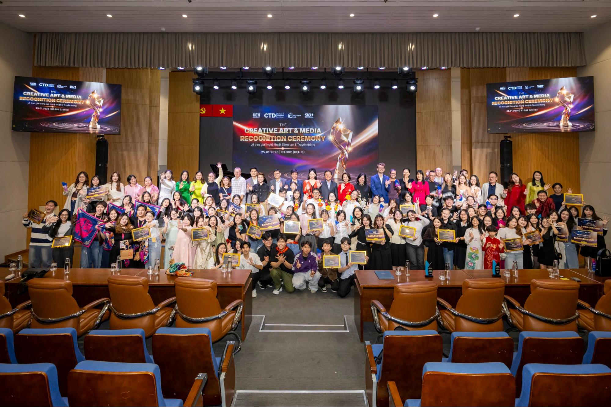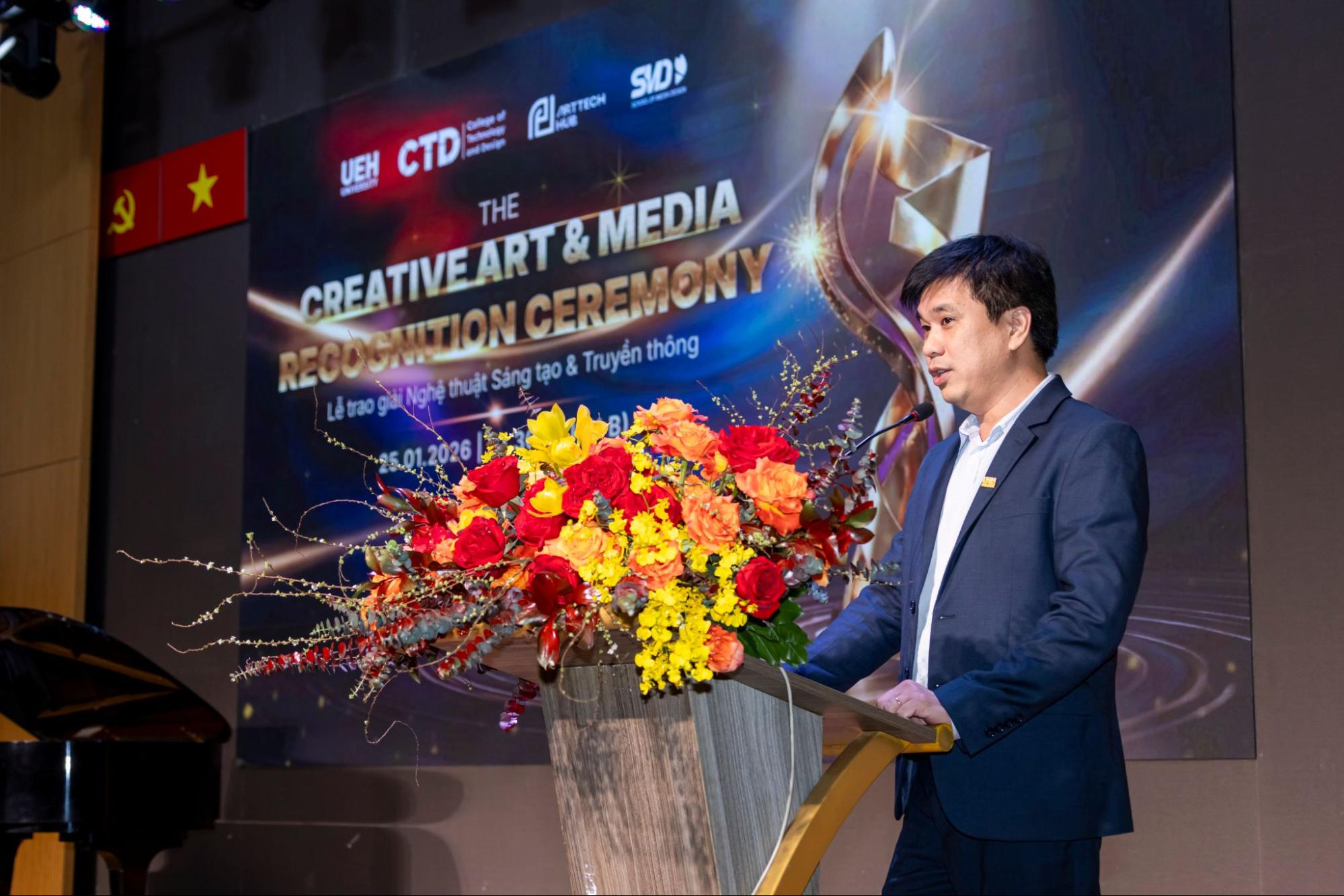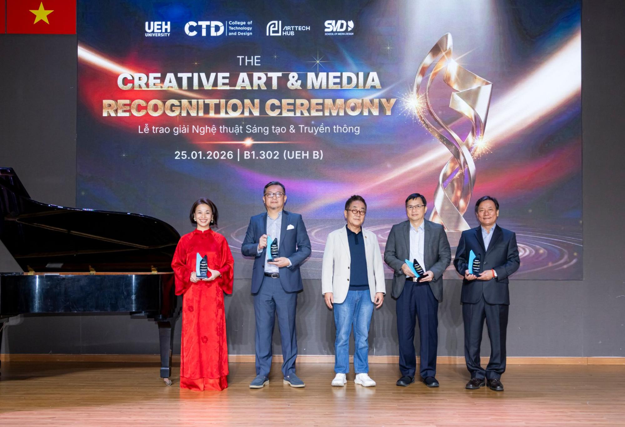 Lễ Vinh danh Sáng tạo Nghệ thuật và Truyền thông khép lại chuỗi sự kiện Tết Art 2026 do Trường Công nghệ và Thiết kế UEH (CTD) đồng phối hợp tổ chức cùng ArtTech Hub và Khoa Thiết kế Truyền thông (SMD). Đây là dấu mốc quan trọng nhằm tổng kết, ghi nhận và lan tỏa những đóng góp tiêu biểu của các nghệ sĩ, những cá nhân truyền cảm hứng và sinh viên trong lĩnh vực nghệ thuật, truyền thông và công nghệ trong năm học vừa qua, khẳng định vai trò của sáng tạo như một động lực thúc đẩy giá trị học thuật và phát triển bền vững trong môi trường đại học.