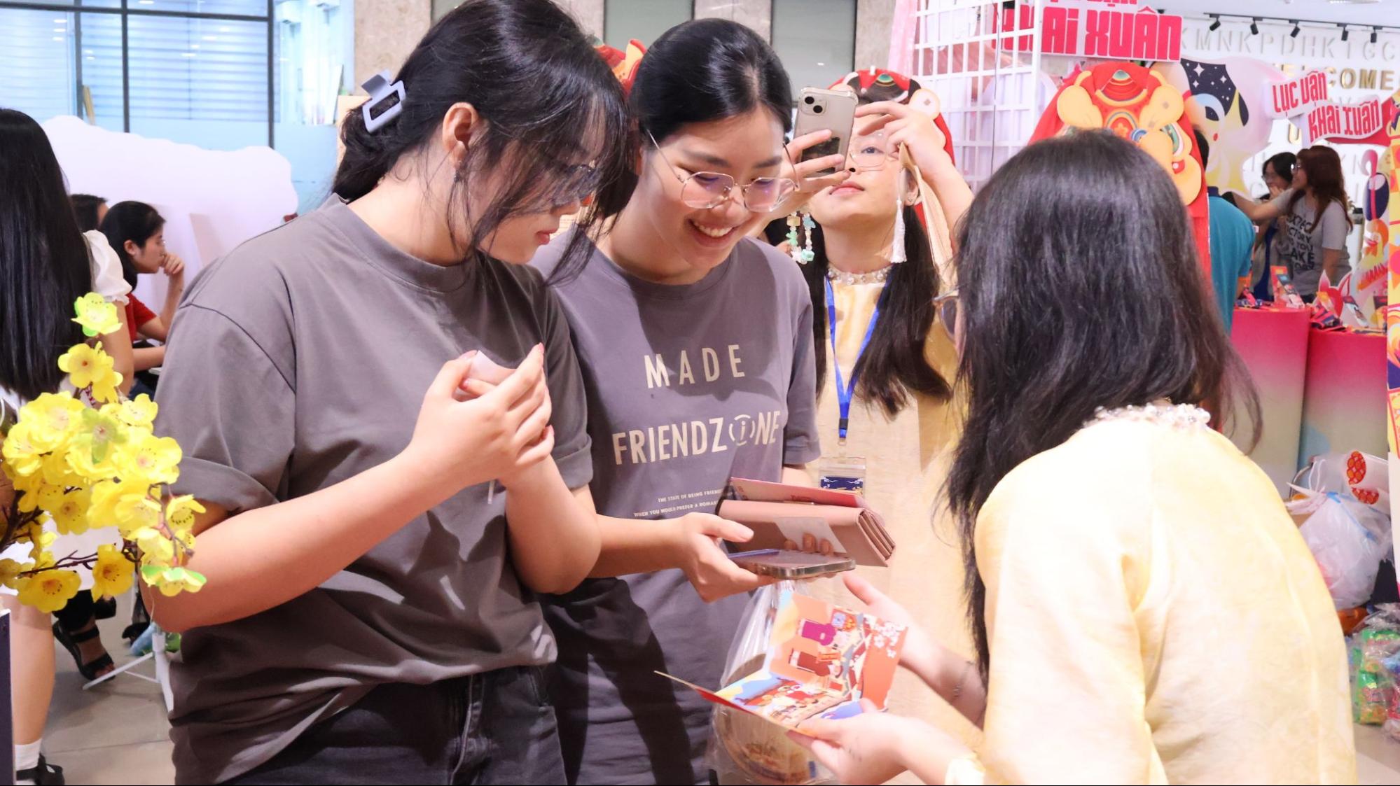 Phiên chợ Tết - Chào Xuân 2026 được tổ chức như không gian giao thoa đa chiều giữa văn hóa, sáng tạo và cộng đồng, với sự tham gia tích cực của sinh viên UEH, các nhóm sáng tạo trẻ và đối tác đồng hành. Các booth giới thiệu sản phẩm thủ công, thiết kế sáng tạo, ấn phẩm Tết, quà tặng nghệ thuật,... cho thấy tiếp cận mới mẻ của thế hệ trẻ đối với di sản văn hóa truyền thống. Nhiều dự án gây ấn tượng như: “Lục Vận Khai Xuân” (lấy cảm hứng từ trò chơi dân gian Bầu Cua Tôm Cá), “Sắc Xuân Thanh Tiên” (kể lại câu chuyện hoa giấy làng nghề Thanh Tiên - Huế), “Phúc Mã Du Xuân” (kết hợp văn hóa treo chữ “Phúc” ngược và truyền thuyết 12 con giáp), hay “Tết Nô Lo Gỳ” (tái hiện hơi ấm gian bếp gia đình). Thông qua các mô hình sáng tạo, phiên chợ góp phần làm mới cách kể chuyện Tết Việt theo hướng bền vững, nhân văn và tăng cường gắn kết cộng đồng.
