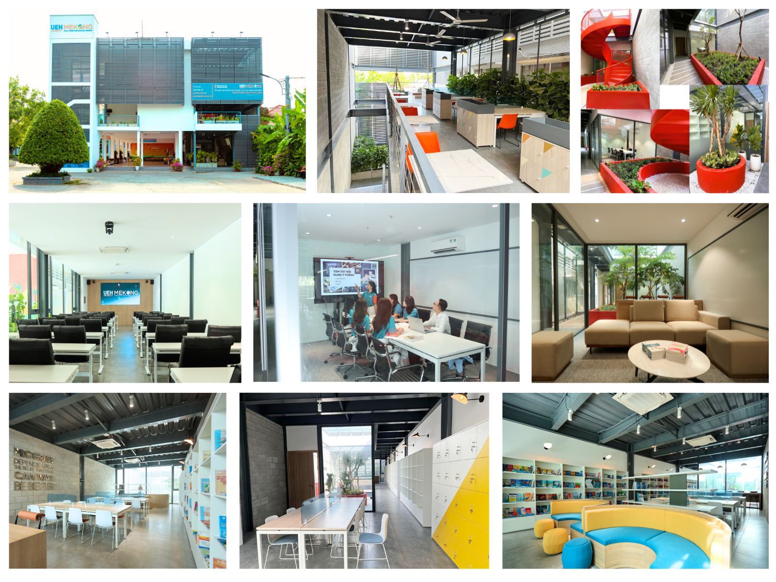 Tại UEH Mekong, Nhà trường đầu tư đồng bộ cơ sở vật chất theo chuẩn quốc tế; 100% phòng học lý thuyết và thực hành triển khai mô hình Hybrid Class, cùng hệ thống studio hiện đại mô phỏng không gian phim trường. Phân hiệu đồng thời phát triển các tiện ích học tập - trải nghiệm như thư viện thông minh kết nối dữ liệu dùng chung với UEH TP.HCM và Start-Up Coffee do sinh viên vận hành.