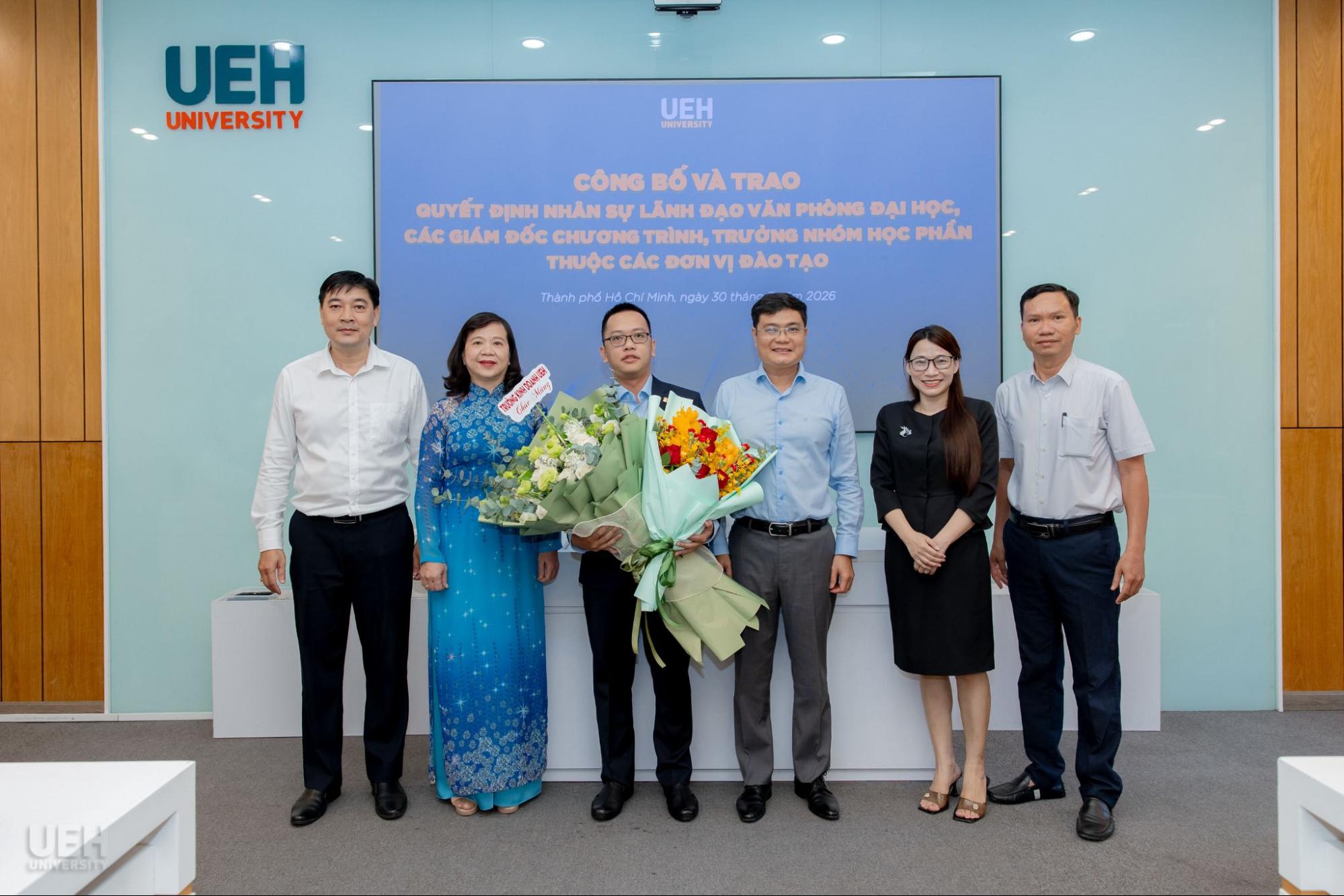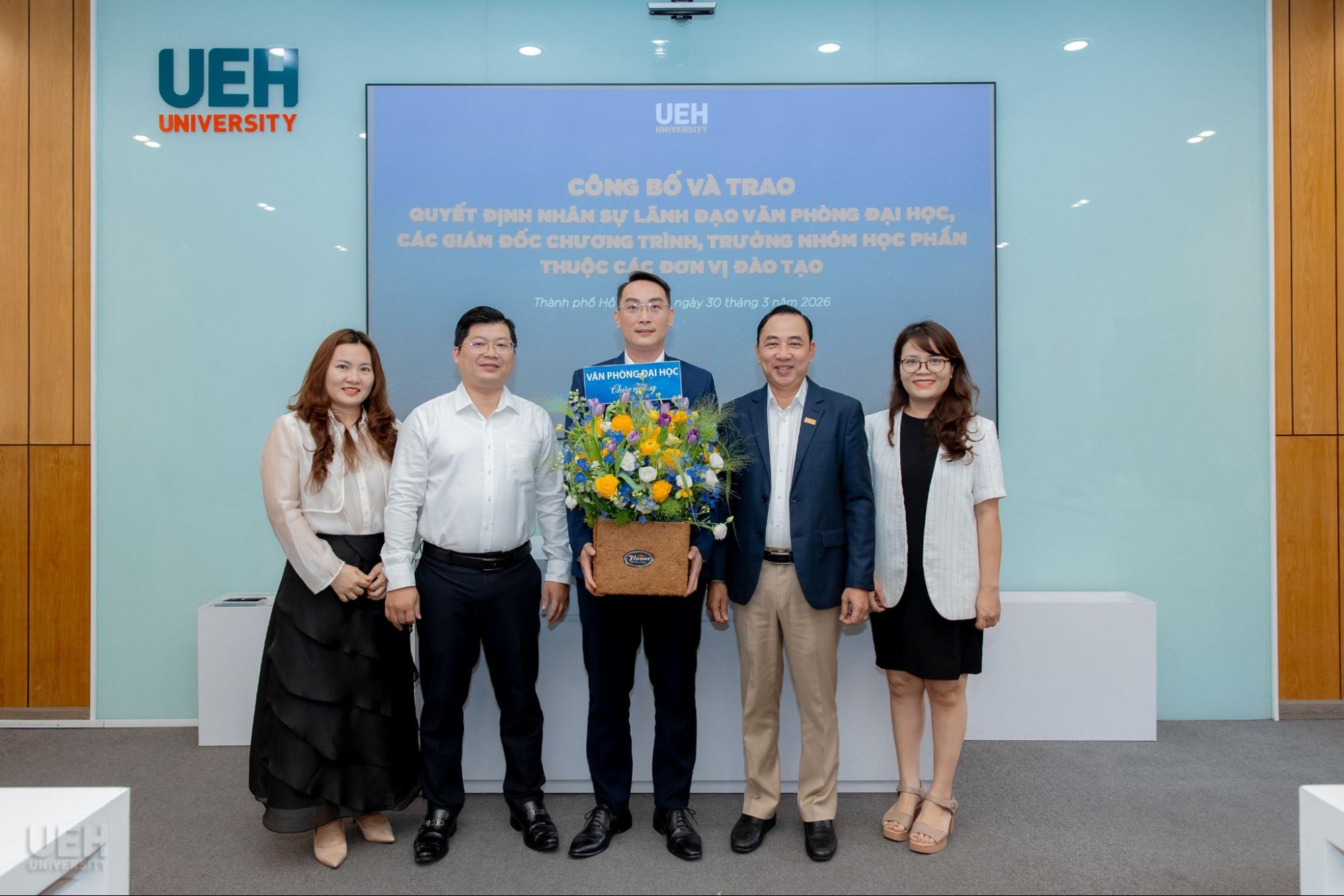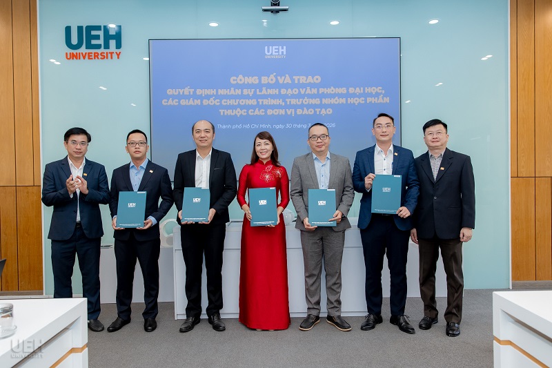 Ngày 30/03/2026, Đại học Kinh tế Thành phố Hồ Chí Minh (UEH) đã tổ chức công bố và trao các quyết định bổ nhiệm nhân sự, góp phần kiện toàn đội ngũ quản lý và chuyên môn, đáp ứng yêu cầu vận hành và phát triển trong giai đoạn mới.