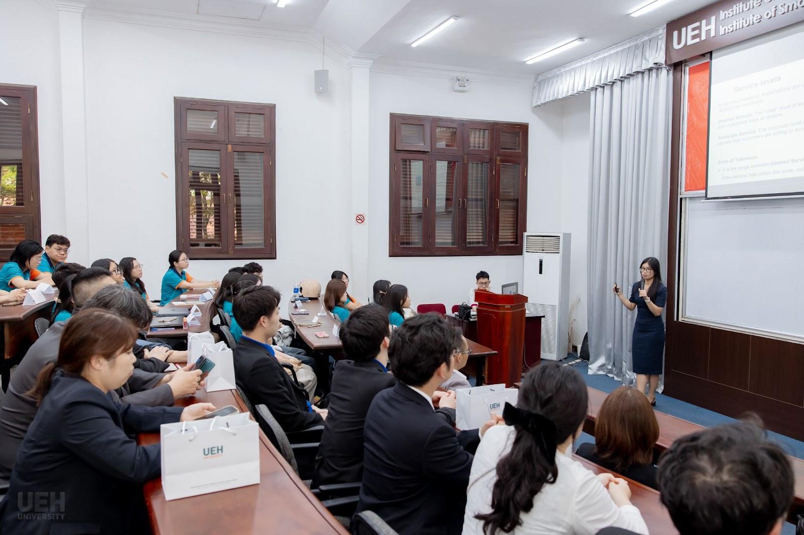 Để trực tiếp trải nghiệm phương pháp giảng dạy kết hợp giữa lý thuyết và thực hành tại UEH, đoàn đối tác đã tham gia vào công tác quan sát lớp học mô phỏng với chủ đề “Kỳ vọng của khách hàng” (Customer Expectation) do giảng viên UEH chủ trì.