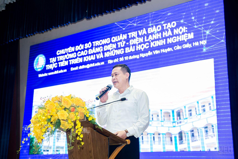 Ông Phạm Trường Sinh - Trưởng Khoa CNTT và Truyền thông, Trường Cao đẳng Điện tử - Điện lạnh Hà Nội trình bày báo cáo “Kinh nghiệm triển khai chuyển đổi số tại trường Cao đẳng”