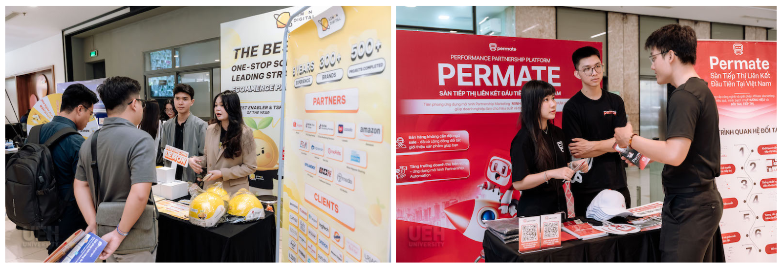 Sôi nổi các hoạt động tại sảnh: Triển lãm giới thiệu chương trình Kết nối cộng đồng - Lan tỏa tri thức - Hành động bền vững của UEH và booth tư vấn của các doanh nghiệp.