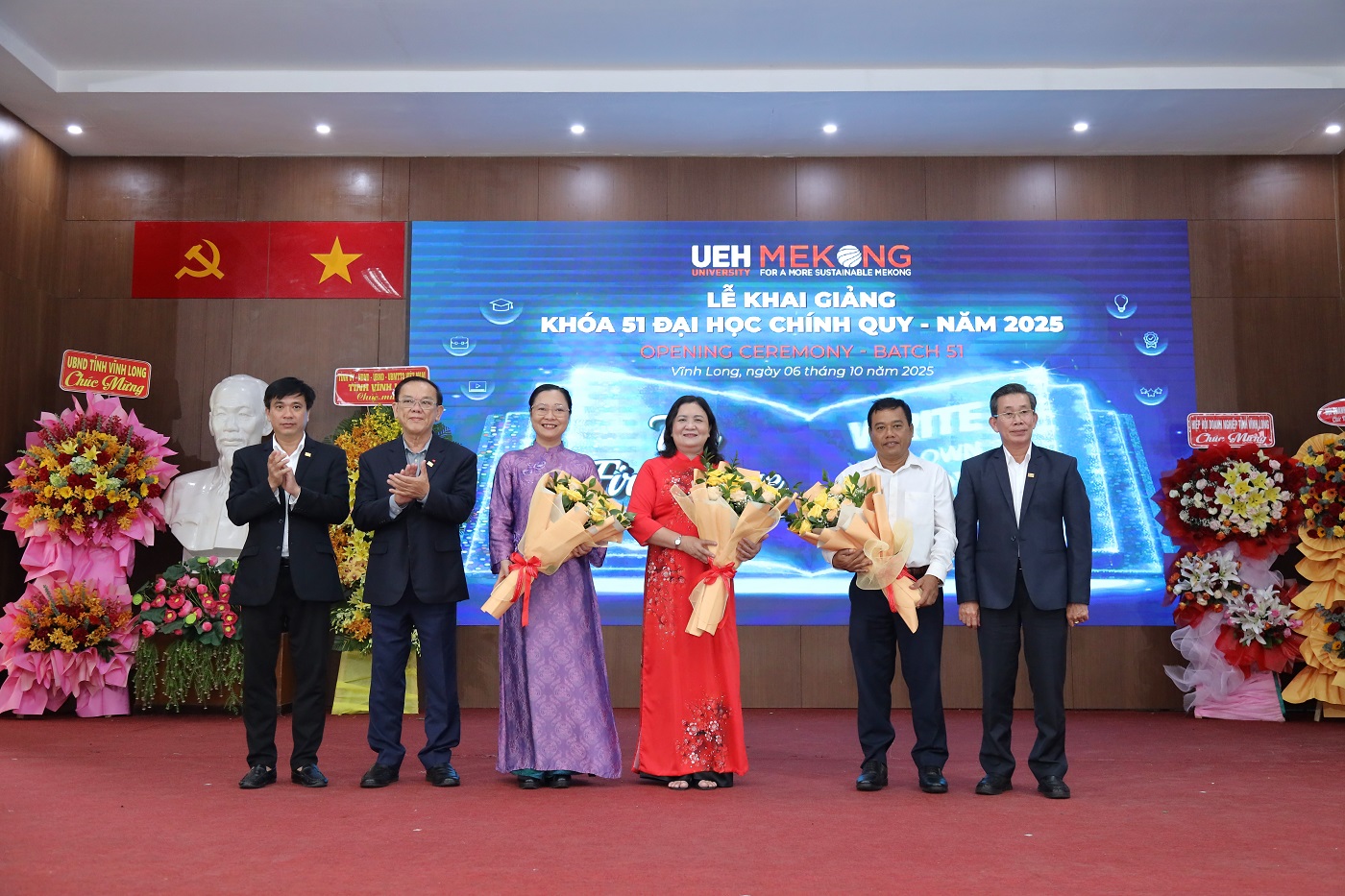Ban Giám đốc UEH trao tặng hoa tri ân đến các lãnh đạo tỉnh Vĩnh Long: Bà Hồ Thị Hoàng Yến - Phó Bí thư thường trực Tỉnh ủy; Ông Kim Rương - Uỷ viên Ban Thường vụ Tỉnh ủy, Phó chủ tịch Hội đồng nhân dân tỉnh; TS. Nguyễn Thị Quyên Thanh - Tỉnh uỷ viên, Phó Chủ tịch Uỷ ban Nhân dân tỉnh trong buổi lễ Khai giảng K51