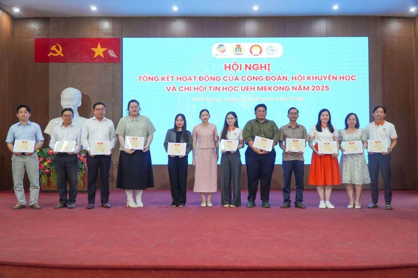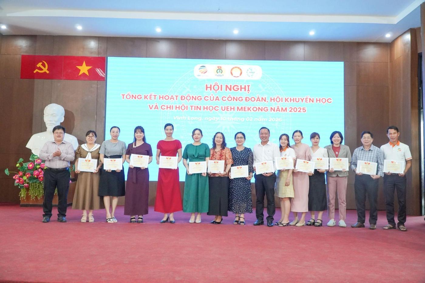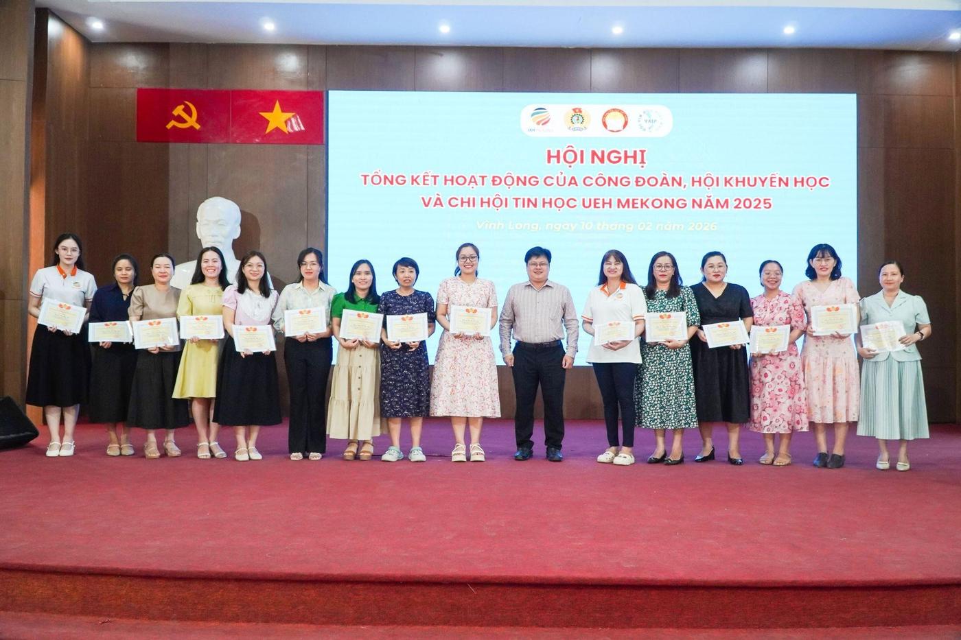 ThS. Hồ Thiện Quyền - Chủ tịch Công đoàn cơ sở trao Giấy khen của Ban Chấp hành Công đoàn cho các cá nhân đạt thành tích Xuất sắc tiêu biểu trong hoạt động Công đoàn cơ sở UEH Mekong năm 2025