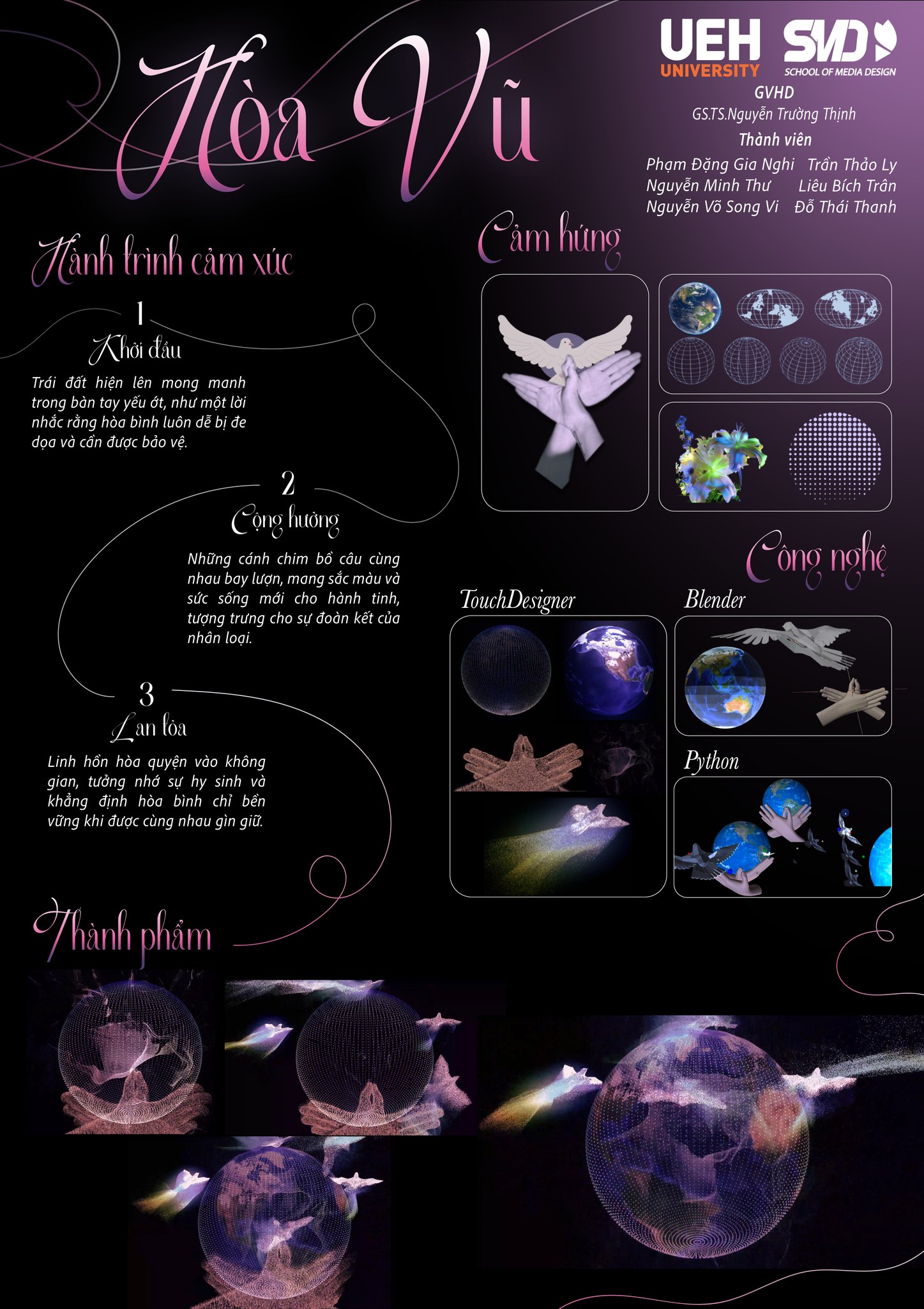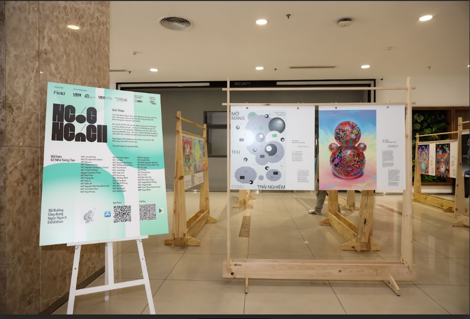 Dòng chảy công nghệ - nghệ thuật tại UEH được khởi nguồn từ chính không gian học thuật, nơi nghệ thuật được tiếp cận như một phương pháp học tập và tư duy giúp người học quan sát, phản biện và kết nối với đời sống đương đại. Trong các không gian trưng bày học phần/dự án, sinh viên không chỉ giới thiệu tác phẩm hoàn thiện mà còn trình bày toàn bộ hành trình sáng tạo, từ quan sát, phân tích lớp nghĩa văn hóa đến chuyển hóa trải nghiệm cá nhân thành hình thức nghệ thuật.
