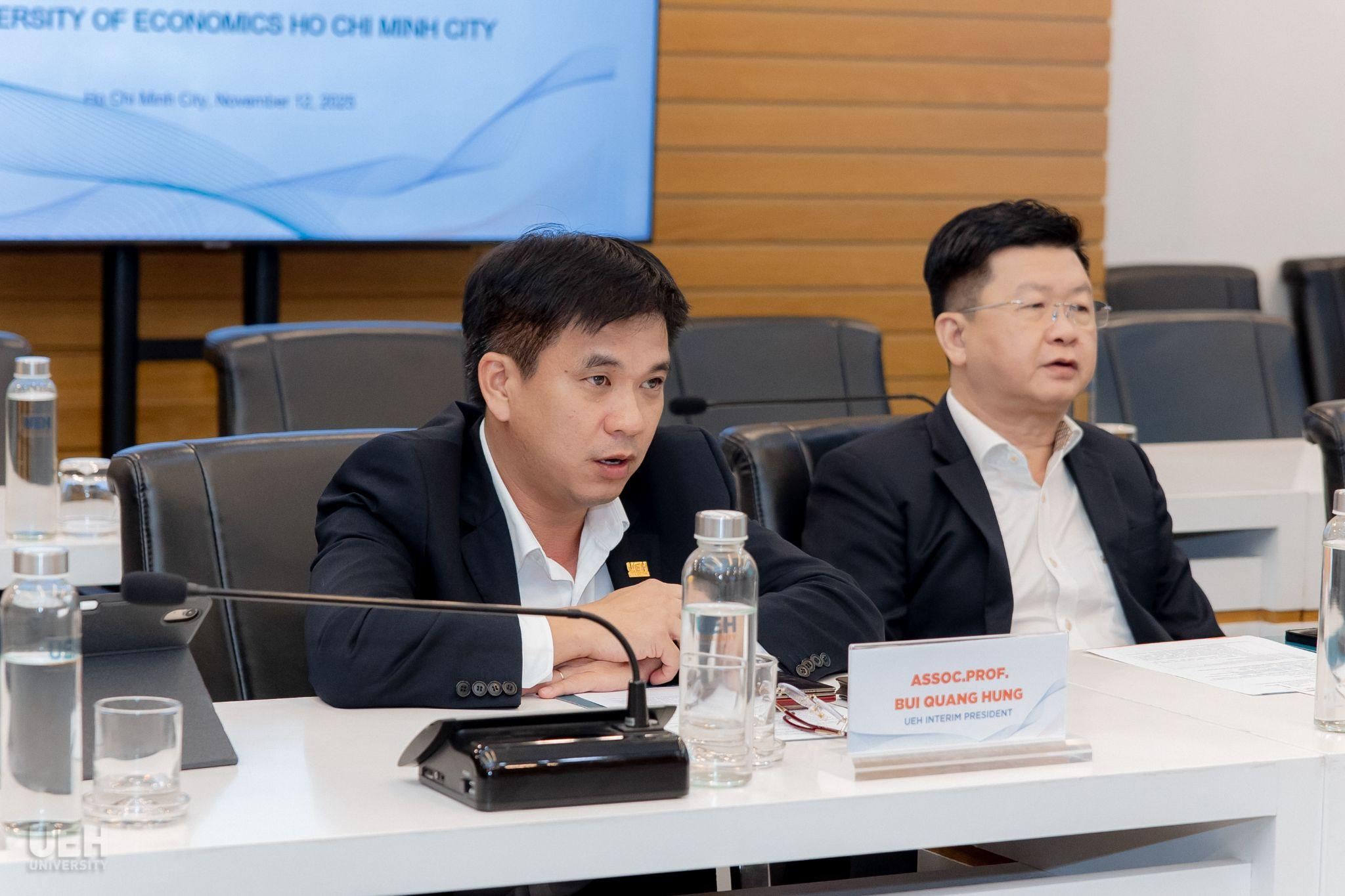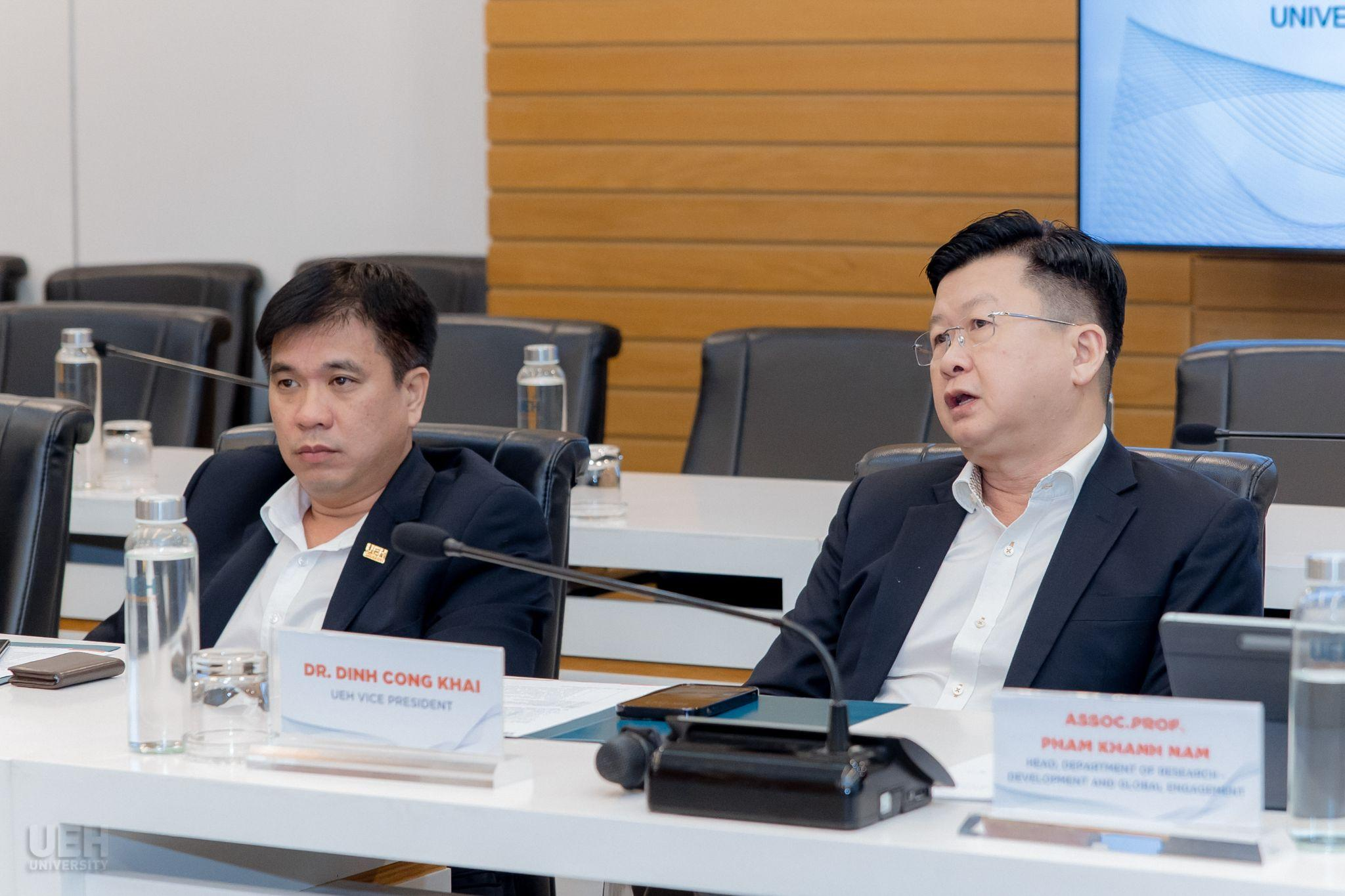 Đón tiếp đoàn, về phía UEH, có PGS.TS. Bùi Quang Hùng – Phó Giám đốc phụ trách UEH, TS. Đinh Công Khải – Phó Giám đốc UEH; TS. Trần Thị Tuấn Anh – Phó Hiệu trưởng Trường Kinh tế, Luật và Quản lý nhà nước UEH (CELG); PGS.TS. Phạm Khánh Nam – Trưởng ban Ban Nghiên cứu - Phát triển và Gắn kết toàn cầu; TS. Đinh Thị Thu Hồng – Trưởng ban Đào tạo; PGS.TS. Phạm Dương Phương Thảo – Phó Trưởng ban Nghiên cứu - Phát triển và Gắn kết toàn cầu; ThS. Lê Thị Hạnh An – Phó Trưởng ban Truyền thông và Phát triển đối tác.