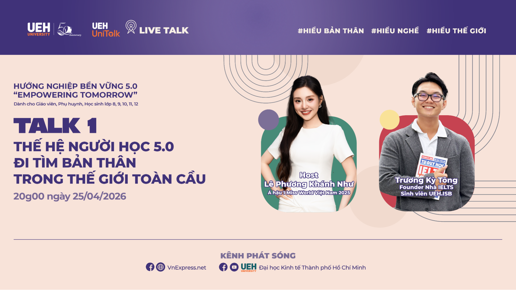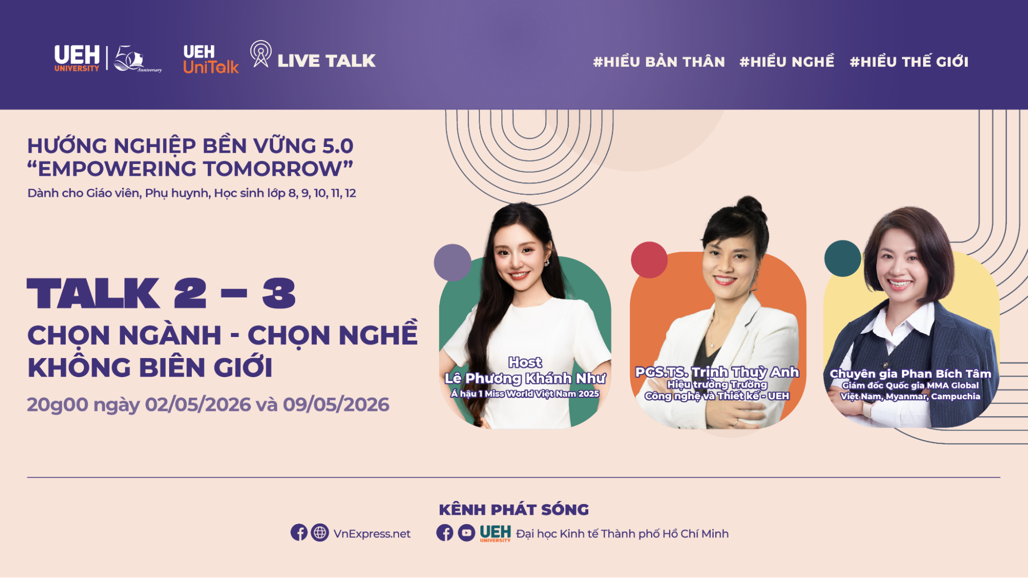 The Sustainable Career Orientation 5.0 Live Talk Series “Empowering Tomorrow” 2026 is broadcast live every Saturday at 8:00 PM on UEH and VnExpress media channels. The practical insights and perspectives shared by speakers will provide an opportunity for parents, teachers, and middle and high school students to proactively adapt, develop interdisciplinary competencies, and build a suitable academic and career pathway in the context of globalization.